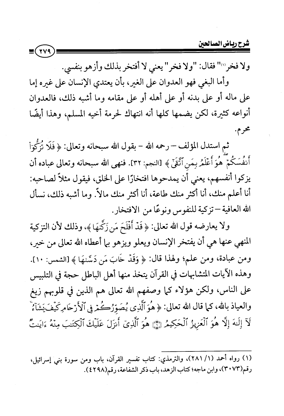ثم استدل المؤلف بقول الله سبحانه وتعالى: {فلا تزكوا أنفسكم هو أعلم بمن اتقى} فنهى الله سبحانه وتعالى عباده أن يزكوا أنفسهم يعني أن يمدحوها افتخارا على الخلق، فيقول مثلا لصاحبه: أنا أعلم منك، أنا أكثر منك طاعة، أنا أكثر منك مالا.