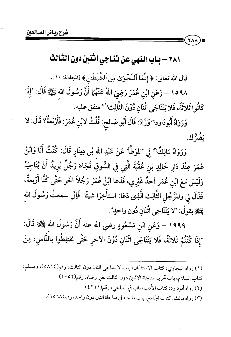 1599 - وعن ابن مسعود رضي الله عنه أن رسول الله صلى الله عليه وسلم قال: إذا كنتم ثلاثة، فلا يتناجى اثنان دون الآخر حتى تختلطوا بالناس، من