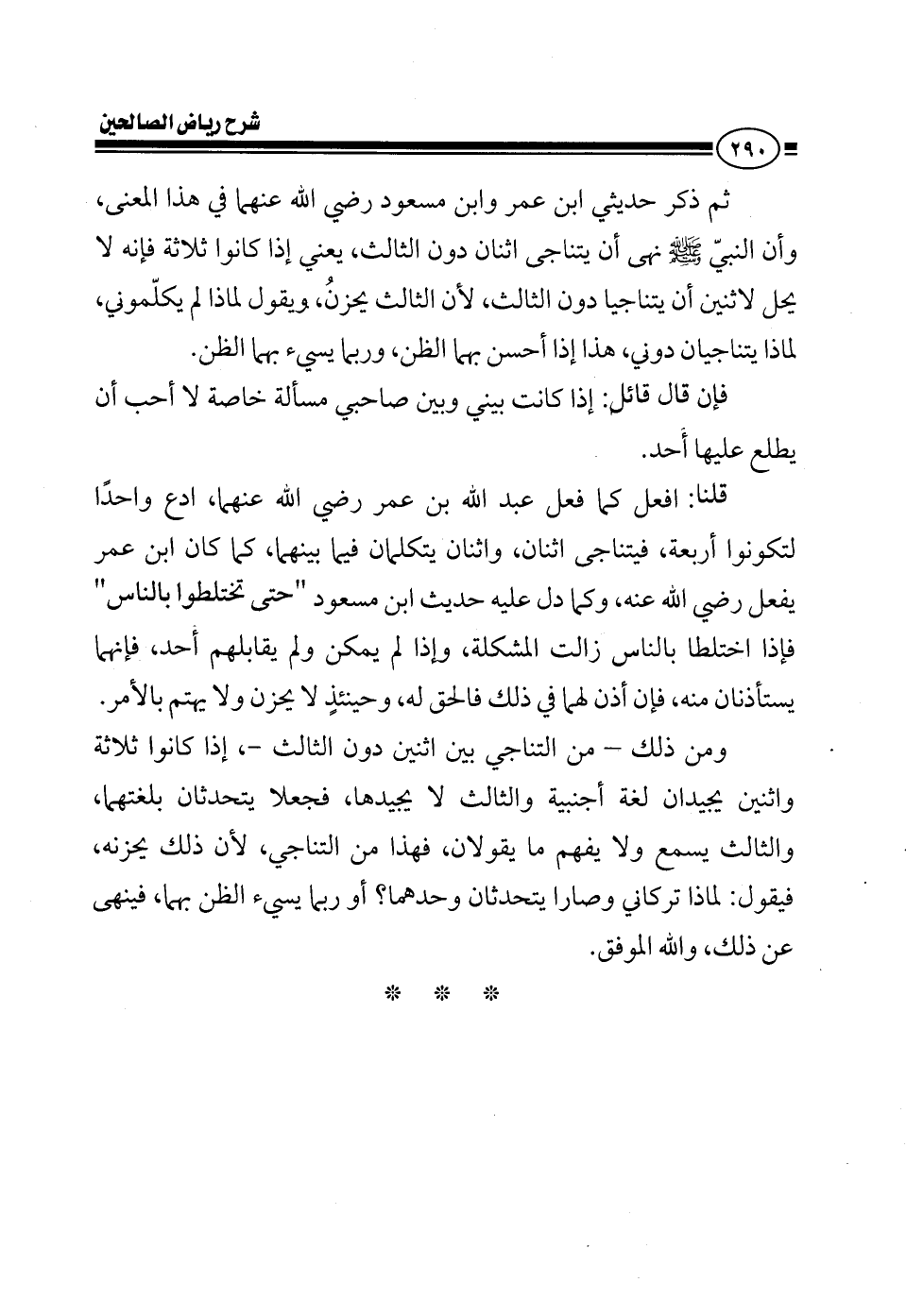 ثم ذكر حديثي ابن عمر وابن مسعود رضي الله عنهما في هذا المعنى، وأن الرسول صلى الله عليه وسلم نهى أن يتناجى اثنان دون الثالث، يعني إذا كانوا ثلاثة فإنه لا يحل لاثنين أن يتناجيا دون الثالث، لأن الثالث يحزن، ويقول لماذا ما كلموني، هذا إذا أحسن بهما الظن، وربما يسيء بهما الظن، ولكن إذا أحسن بهما الظن قال لماذا أنا ليس لي قيمة؟ يتناجيان دوني؟ فلذلك نهى النبي صلى الله عليه وسلم عن هذا، ولا شك أن هذا من الآداب.