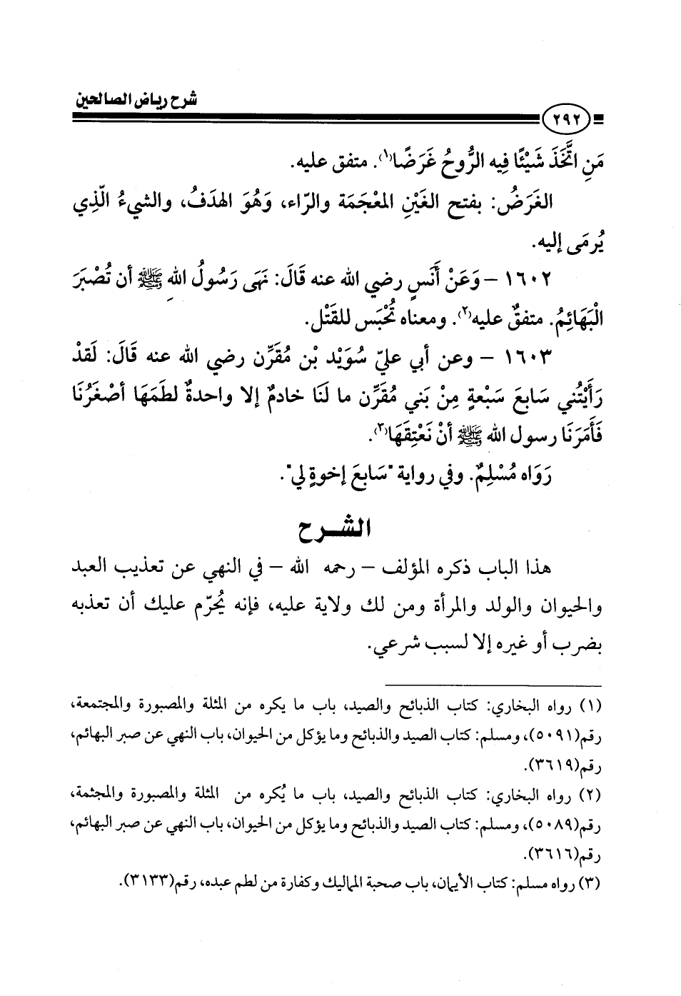 1602 - وعن أنس رضي الله عنه قال: نهى رسول الله صلى الله عليه وسلم أن تصبر البهائم متفق عليه.