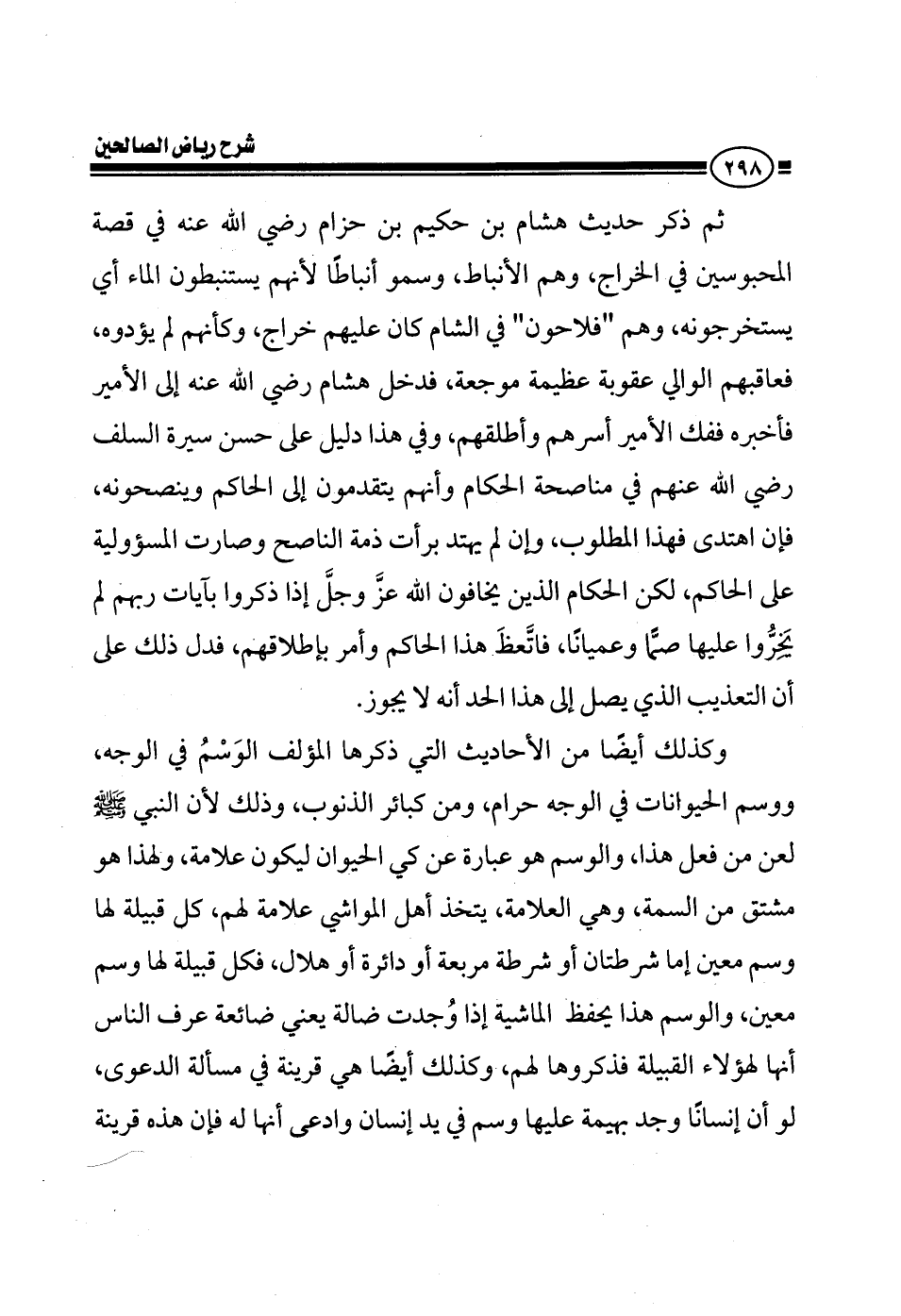 ثم ذكر حديث هشام بن حكيم بن حزام رضي الله عنه، في قصة المحبوسين في الخراج، المحبوسين في الخراج وهم الأنباط، وسموا أنباطا لأنهم يستنبطون الماء أي يستخرجونه، وهم فلاليح فلاحون في الشام عليهم خراج، وكأنهم لم يؤدوه، فعاقبهم الأمير هذه العقوبة العظيمة، جعلهم في الشمس في الحر الشديد وصب على رؤوسهم الزيت، لأن الزيت تشتد حرارته مع الشمس، وهذا عذاب عظيم مؤلم موجع، فدخل هشام رضي الله عنه إلى الأمير فأخبره ففك الأمير أسرهم وأطلقهم، وفي هذا دليل على حسن سيرة السلف رضي الله عنهم في مناصحة الحكام وأنهم يتقدمون إلى الحاكم وينصحونه، فإن اهتدى فهذا المطلوب، وإن لم يهتد برأت ذمة الناصح وصارت المسئولية على الحاكم لكن الحكام الذين يخافون الله عز وجل إذا ذكروا بآيات ربهم لم يخروا عليها صما وعميانا، اتعظ هذا الحاكم وأمر بإطلاقهم، فدل هذا على أن التعذيب الذي يصل إلى هذا الحد أنه لا يجوز.