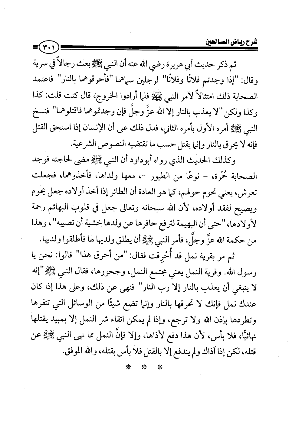 قرية النمل يعني مجتمع النمل، جحورها، أحرقوها بالنار، فقال النبي صلى الله عليه وسلم: إنه لا ينبغي أن يعذب بالنار إلا رب النار فنهى عن ذلك، وعلى هذا إذا كان عندك نمل فإنك لا تحرقها بالنار وإنما تضع شيئا يطردها مثل الجاز إذا صفيته على الحجر فإنها تنفر بإذن الله ولا ترجع، وإذا لم يمكن اتقاء شرها إلا بمبيد يقتلها نهائيا، أعني النمل، فلا بأس، لأن هذا دفع لأذاها، وإلا فالنمل مما نهى النبي صلى الله عليه وسلم عن قتله، لكن إذا آذاك ولم يندفع إلا بالقتل فلا بأس بقتله