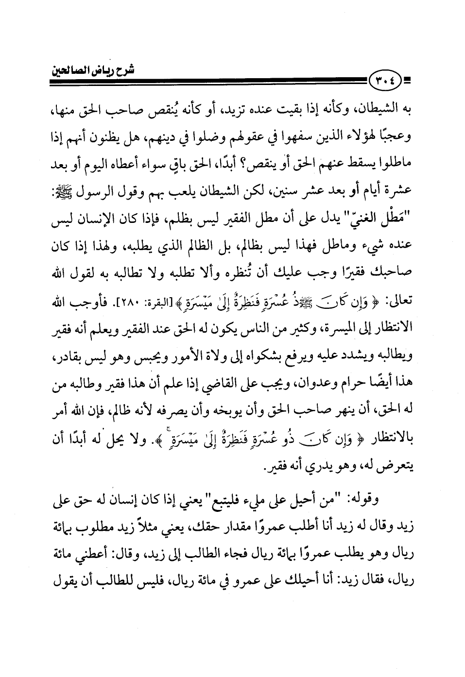 به الشيطان وكأنه إذا بقيت عنده تزيد وكأنها تنقص يعني ينقص صاحب الحق منها وعجبا لهؤلاء الذين سفهوا في عقولهم وضلوا في دينهم هل يظنون أنهم إذا ماطلوا يسقط عنهم الحق أو ينقص أبدا الحق باق سراء أعطاه اليوم أو بعد عشرة أيام أو بعد عشر سنين لكن الشيطان يلعب بهم وقول الرسول صلى الله عليه وسلم: مطل الغني يدل على أن مطل الفقير ليس بظلم إذا كان الإنسان ليس عنده شيء وماطل فهذا ليس بظالم بل الظالم الذي يطلبه ولهذا إذا كان صاحبك فقيرا وجب عليك أن تنظره وألا تطلبه وألا تطالبه به لقول الله تعالى {وإن كان ذو عسرة فنظرة إلى ميسرة} فأوجب الله الانتظار إلى الميسرة وكثير من الناس يكون له الحق عند الفقير ويعلم أنه فقير ويطالبه ويشدد عليه ويرفع بشكواه إلى ولاة الأمور ويحبس على دينه وهو ليس بقادر هذا أيضا حرام وعدوان ويجب على القاضي إذا علم أن هذا فقير وطالبه من له الحق يجب عليه أن ينهر صاحب الحق وأن يوبخه وأن يصرفه لأنه ظالم فإن الله أمره بالانتظار {وإن كان ذو عسرة فنظرة إلى ميسرة} ولا يحل له أبدا أن يقول له أعطني حقي وهو يدري أنه فقير ولا يتعرض له وقوله: من أحيل على مليء فليتبع يعني إذا كان إنسان له حق على زيد وقال له زيد أنا أطلب عمرا مقدار حقي يعني مثلا زيد مطلوب 100 ريال وهو يطلب عمرا 100 ريال فقال أنا أحيلك على عمرو في 100 ريال فليس للطالب أن يقول