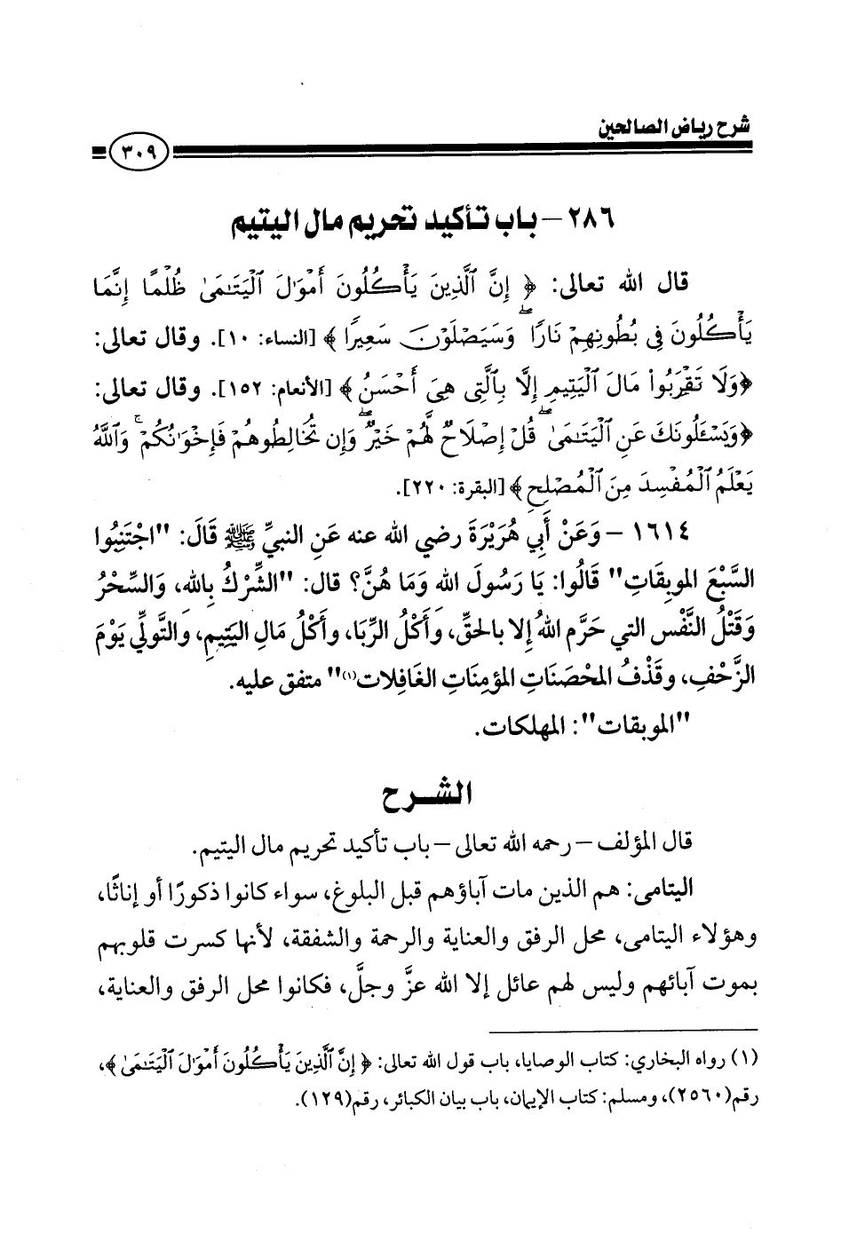 EXقال المؤلف رحمه الله تعالى في كتابه رياض الصالحين باب تحريم أموال اليتامى اليتامى هم الذين مات آباؤهم قبل البلوغ سواء كانوا ذكورا أو إناثا وهؤلاء أعني اليتامى محل الرفق والعناية والرحمة والشفقة لأنهم كسرت قلوبهم بموت آبائهم وليس لهم عائل إلا الله عز وجل فكانوا محل الرفق والعناية