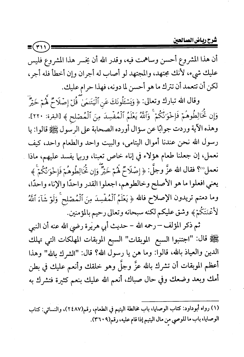 أن هذا المشروع أحسن وساهمت فيه وقدر الله أن يخسر هذا المشروع فليس عليك شيء لأنك مجتهد والمجتهد لو أصاب له أجران وإن أخطأ فله أجر لكن تتعمد أن تترك ما هو أحسن لما دونه هذا حرام عليك وقال الله تبارك تعالى: {ويسئلونك عن اليتامى قل إصلاح لهم خير وإن تخالطوا فإخوانكم} وهذه الآية وردت جوابا عن سؤال أورده الصحابة على الرسول صلى الله عليه وسلم قالوا يا رسول الله نحن عندنا أموال اليتامى والبيت واحد والطعام واحد كيف نعمل إن جعلنا طعام هؤلاء في إناء خاص تعبنا وربما يفسد عليهم ماذا نعمل فقال الله عز وجل {إصلاح لهم خير وإن تخالطوهم فإخوانكم} يعني افعلوا ما هو الأصلح وخالطوهم اجعلوا القدر واحد والإناء واحد وما دمتم تريدون الإصلاح فالله يعلم المفسد من المصلح ولو شاء الله لأعنتكم وشق عليكم لكنه سبحانه وتعالى رحيم بالمؤمنين ثم ذكر حديث أبي هريرة رضي الله عنه أن النبي صلى الله عليه وسلم قال: اجتنبوا السبع الموبقات السبع الموبقات المهلكات التي تهلك الدين والعياذ بالله قالوا وما هن يا رسول الله قال الشرك بالله وهذا أعظم الموبقات أن تشرك بالله عز وجل وهو خلقك وأنعم عليك في بطن أمك وبعد وضعك وفي حال صباك أنعم الله عليك بنعم كثيرة فتشرك به