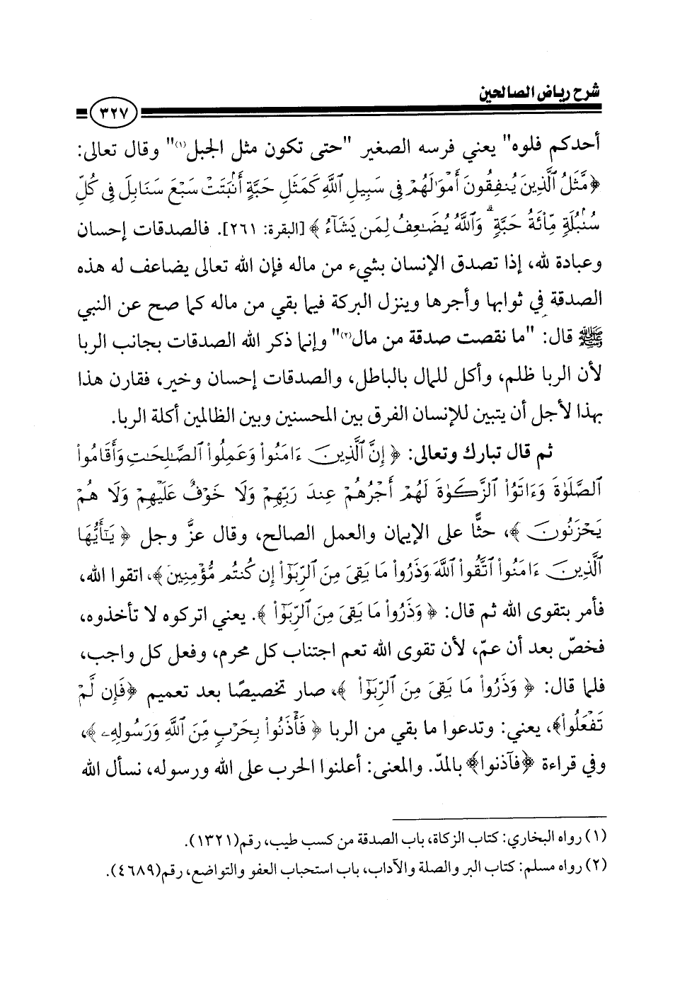 أحدكم فلوه يعني فرسه الصغير حتى تكون مثل الجبل وقال تعالى {مثل الذين ينفقون أموالهم في سبيل الله كمثل حبة أنبتت سبع سنابل في كل سنبلة مائة حبة والله يضاعف لمن يشاء والله} فالصدقات إحسان وعبادة لله إذا تصدق الإنسان بشيء من ماله فإن لله تعالى يضاعف له هذه الصدقة في ثوابها وأجرها وينزل البركة فيما بقي من ماله كما صح عن النبي صلى الله عليه وسلم قال: ما نقصت صدقة من مال وإنما ذكر الله الصدقات بجانب الربا لأن الربا ظلم ظلم وأخذ للمال بالباطل والصدقات إحسان وخير فقارن هذا بهذا لأجل أن يتبين للإنسان الفرق بين المحسنين وبين الظالمين أكلة الربا ثم قال: {إن الذين أمنوا وعملوا الصالحات وأقاموا الصلاة وآتوا الزكاة لهم أجرهم عند ربهم ولا خوف عليهم ولا هم يحزنون} حثا على الإيمان والعمل الصالح ثم قال عز وجل {يا أيها الذين أمنوا اتقوا الله وذروا ما بقى من الربا إن كنتم مؤمنين} اتقوا فأمر بتقوى الله ثم قال: {وذروا ما بقي من الربا} يعني اتركوه لا تأخذونه فخص بعد أن عم لأن تقوى الله تعم اجتناب كل محرم وفعل كل واجب ولما قال: {وذروا ما بقى من الربا} صار تخصيصا بعد تعميم {فإن لم تفعلوا} يعني وتدعوا ما بقي من الربا {فأذنوا بحرب من الله ورسوله} وفي قراءة {فآذنوا بحرب من الله ورسوله} والمعنى أعلنوا الحرب على الله ورسوله نسأل الله