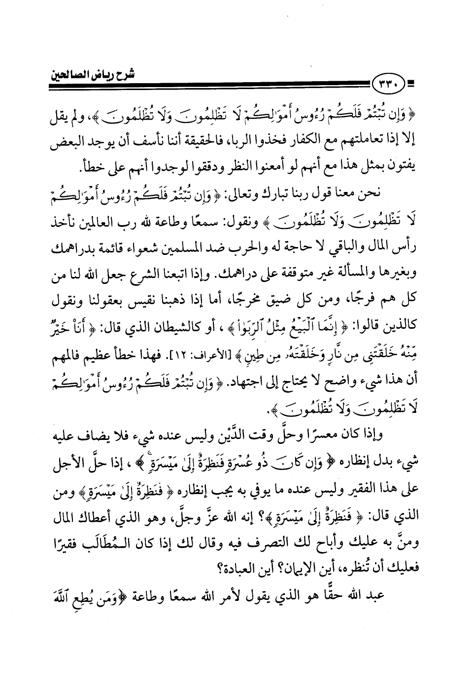 وإن تبتم فلكم رءوس أموالكم لا تظلمون ولا تظلمون {ولم يقل إلا إذا تعاملتم مع الكفار فخذوا الربا فالحقيقة أننا نأسف أن يوجد بعض من يشار إليه يفتون بمثل هذا مع أنهم لو أمعنوا النظر ودققوا لوجدوا أنهم على خطأ أنا معي قال لي ربي لك رأس مالك لا تظلم ولا تظلم أقول سمعا لك يا ربي وطاعة آخذ رأس مالي والباقي ما علي منه دعهم يجعلونه فيما يريدون ثم هل هؤلاء ما بقي عليهم أن يعمروا الكنائس إلا بربح يأخذونه مني الكنائس معمرة وحرب المسلمين شعواء بدراهمك وبغير دراهمك هل المسألة متوقفة على دراهمك يأخذونها ويصرفونها في الكنائس أو في حرب المسلمين هذا إذا قدرنا أنهم صرفوها في ذلك لكن هذا وهم وتخيل يلبس بها الشيطان يقول إن تركتم هذا صرفوه في الكنائس وفي إرهاب المسلمين من قال هذا فعلى كل حال نحن بيننا وبين الناس كتاب الله} وإن تبتم فلكم رءوس أموالكم لا تظلمون ولا تظلمون {وإذا اتبعنا الشرع جعل الله لنا من كل هم فرجا ومن كل ضيق مخرجا أما إذا ذهبنا نقيس بعقولنا ونقول كالذين قالوا} إنما البيع مثل الربا {أو كالشيطان الذي قال} أنا خير منه خلقتني من نار وخلقته من طين {هذا غلط غلط عظيم فالمهم أن هذا يا إخواني شيء واضح ما يحتاج إلى اجتهاد} وإن تبتم فلكم رءوس أموالكم لا تظلمون ولا تظلمون {إذا كان معسرا وحل وقت الدين وليس عنده شيء ألا أضيف عليه شيئا بدل إنظاره أصبر عليه لمدة يقول ما أخالفك ما عندك شيء الآن لكن هذا الألف نجعلها ألف ومائة إلى سنة يقول لا أبصر الآية التي بعدها} وإن كان ذو عشرة فنظرة إلى مسرة {ما فيه حل الأجل على هذا الفقير وليس عنده ما يوفي به يجب عليك إنظاره} فنظرة إلى ميسرة {من الذي قال نظرة إلى ميسرة الله عز وجل هو الذي أعطاك المال ومن به عليك وأباح لك التصرف فيه وقال لك إذا كان المطلوب فقيرا فعليك أن تنظره تقوله ما أنظرك هيا إلى الحبس وإلا إضافة الربا أين الإيمان أين العبادة العبد حقا هو الذي يقول لله سمعا وطاعة