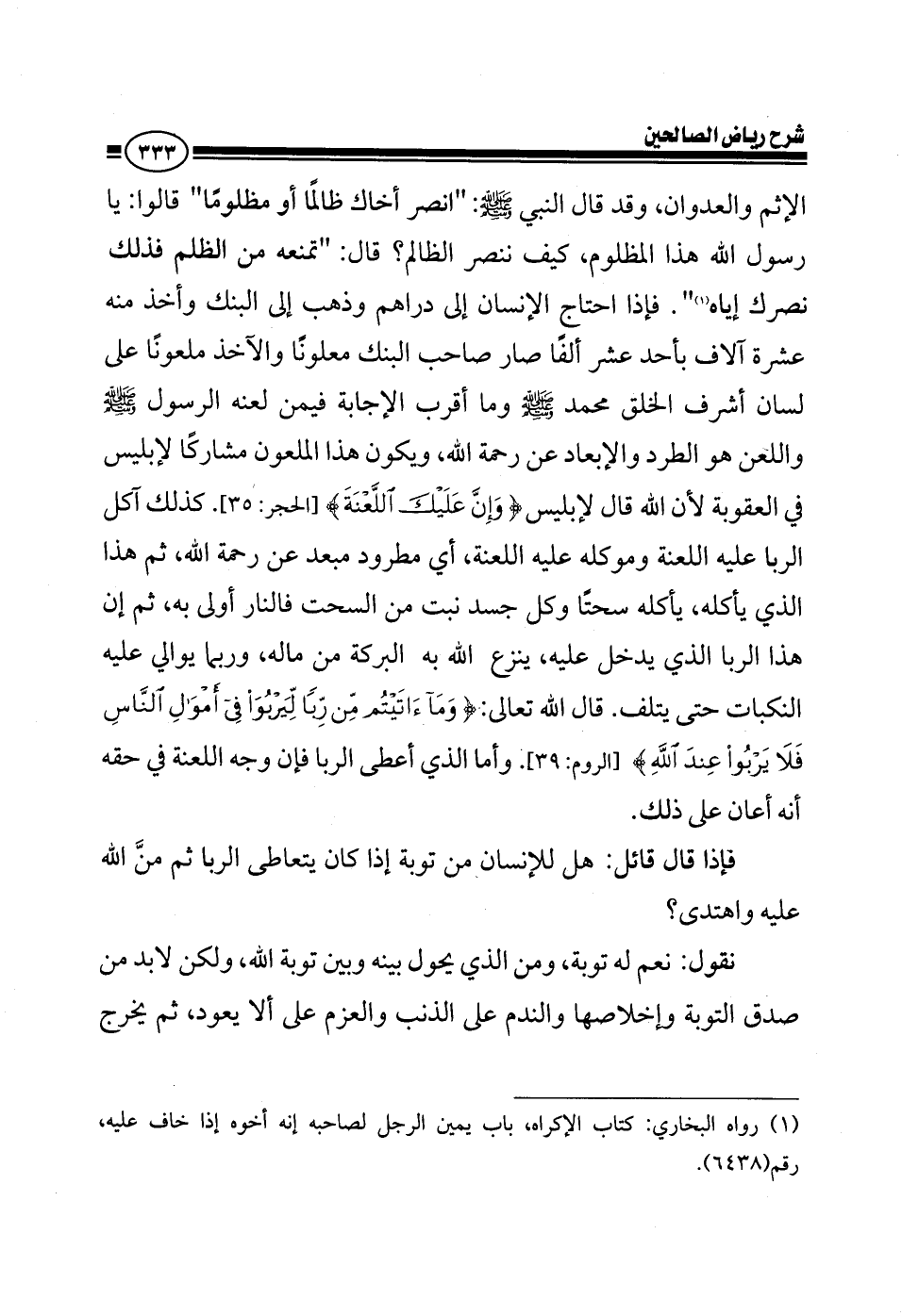 الإثم والعدوان وقد قال النبي صلى الله عليه وسلم انصر أخاك ظالما أو مظلوما قالوا يا رسول الله هذا المظلوم كيف ننصر الظالم قال تمنعه من الظلم فذلك نصرك إياه فإذا احتاج الإنسان إلى دراهم وذهب إلى البنك وأخذ منه عشرة آلاف بأحد عشر ألفا صار صاحب البنك ملعونا والآخذ ملعونا على لسان أشرف الخلق محمد صلى الله عليه وسلم وما أقرب الإجابة فيمن لعنه الرسول صلى الله عليه وسلم واللعن هو الطرد والإبعاد عن رحمة الله ويكون هذا الملعون مشاركا لإبليس في العقوبة لأن الله قال لإبليس {وإن عليك اللعنة} كذلك آكل الربا عليه اللعنة وموكله عليه اللعنة مطرود مبعد عن رحمة الله ثم هذا الذي يأكله يأكله سحتا وكل جسد نبت من السحت فالنار أولى به ثم إن هذا الربا الذي يدخل عليك ينزع الله به البركة من مالك وربما يوالي عليه النكبات حتى يلتف قال الله تعالى {وما آتيتم من ربا ليربوا في أموال الناس فلا يربوا عند الله} وأما الذي أعطى الربا فإن وجه اللعنة في حقه أنه أعان على ذلك فإذا قال قائل هل الإنسان من توبة إذا كان يتعاطى الربا ثم من الله عليه واهتدى نقول نعم له توبة ومن الذي يحول بينه وبين توبة الله ولكن لابد من صدق التوبة وإخلاصها والندم على الذنب والعزم على ألا يعود