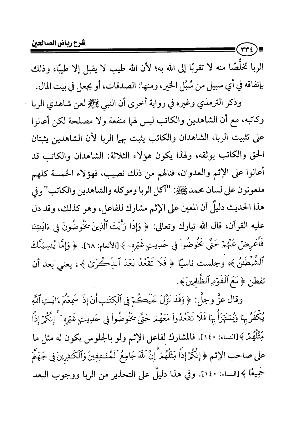 ثم إن كان صاحب الربا الذي أخذ منه قد استفاد فإن الربا يأخذ من المرابي ويتصدق به أو يوضع في بيت المال وإن كان لم يستفد فإنه يعطي المطلوب لأنه إذا استفاد لا يمكن أن نجمع له بين الحق من الربا وبين انتفاعه نقول أنت حظك الانتفاع ولكن إذا كان لم ينتفع فإنه يعطي ما أخذ من الربا وذكر الترمذي وغيره في رواية أخرى أن النبي صلى الله عليه وسلم لعن شاهدي الربا وكاتبه مع أن الشاهدين والكاتب ليس لهما منفعة لكن أعانوا على تثبيت الربا الشاهدان والكاتب يثبت بهما الربا لأن الشاهدين يثبتان الحق والكاتب يوثقه ولهذا يكون هؤلاء الثلاثة الشاهدان والكاتب قد أعانوا على الإثم والعدوان فنالهم من ذلك نصيب فهؤلاء الخمسة كلهم ملعونون على لسان محمد صلى الله عليه وسلم آكل الربا وموكله والشاهدين والكاتب خمسة وفي هذا الحديث دليل أن المعين على الإثم مشارك للفاعل وهو كذلك وهذا قد دل عليه القرآن قال الله تبارك وتعالى {وإذا رأيت الذين يخوضون في آياتنا فأعرض عنهم حتى يخوضوا في حديث غيره} وإما ينسينك الشيطان {وجلست ناسيا} فلا تقعد بعد الذكرى {يعني بعد أن تفطن} مع القوم الظالمين {وقال عز وجل} وقد نزل عليكم في الكتاب أن إذا سمعتم آيات الله يكفر بها ويستهزأ بها فلا تقعدوا معهم حتى يخوضوا في حديث غيره إنكم إذا مثلهم {فالمشارك لفاعل الإثم ولو بالجلوس يكون له مثل على ما صاحب الإثم} إنكم إذا مثلهم إن الله جامع المنافقين والكافرين في جهنم جميعا {في هذا دليل على التحذير من الربا ووجوب البعد