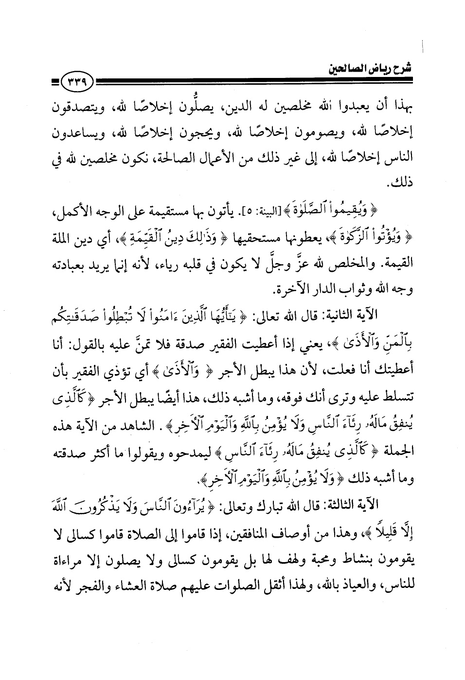 بهذا أن يعبدوا الله مخلصين له الدين يصلون إخلاصا لله ويتصدقون إخلاصا لله ويصومون إخلاصا لله ويحجون إخلاصا لله ويساعدون الناس إخلاصا له إلى غير ذلك من الأعمال الصالحة نكون مخلصين لله في ذلك {وَيُقِيمُوا الصَّلاَةَ} يأتون بها مستقيمة على الوجه الأكمل {وَيُؤْتُوا الزَّكَاةَ} يعطونها مستحقها {وَذَلِكَ دِينُ القَيِّمَةِ} أي دين الملة القيمة والمخلص لله عز وجل لا يكون في قلبه رياء لأنه إنما يريد بعبادته وجه الله وثواب الله والدار الآخرة وقال تعالى {يَا أَيُّهَا الَّذِينَ آمَنُوا لاَ تُبْطِلُوا صَدَقَاتِكُم بِالْمَنِّ وَالأذَى} يعني إذا أعطيت الفقير صدقة فلا تمن عليه وتبقى كل ساعة تقول أنا أعطيتك أنا فعلت لأن هذا يبطل الأجر والأذى تؤذيه تؤذي الفقير بأن تتسلط عليه وترى أنك فوقه وما أشبه ذلك هذا أيضا يبطل الأجر {كَالَّذِي يُنْفِقُ مَالَهُ رِئَاءَ النَّاسِ وَلاَ يُؤْمِنُ بِاللهِ وَالْيَوْمِ الآَخِرِ} الشاهد هذا الشاهد من الآية هذه الجملة كالذي ينفق ماله رئاء الناس ليمدحوه ويقولوا ما أكثر صدقته وما أشبه ذلك {وَلاَ يُؤْمِنُ بِاللهِ وَالْيَوْمِ الآَخِرِ} وقال الله تبارك وتعالى {يُرَاءُونَ النَّاسَ وَلاَ يَذْكُرُونَ اللهَ إِلاَّ قَلِيلاً} وهذا من أوصاف المنافقين إذا قاموا إلى الصلاة قاموا كسالى ولا يقومون بنشاط ومحبة ولهف لها بل يقومون كسالى وأيضا لا يصلون إلا مراءاة للناس والعياذ بالله ولهذا أثقل الصلوات عليهم صلاة العشاء والفجر لأنه