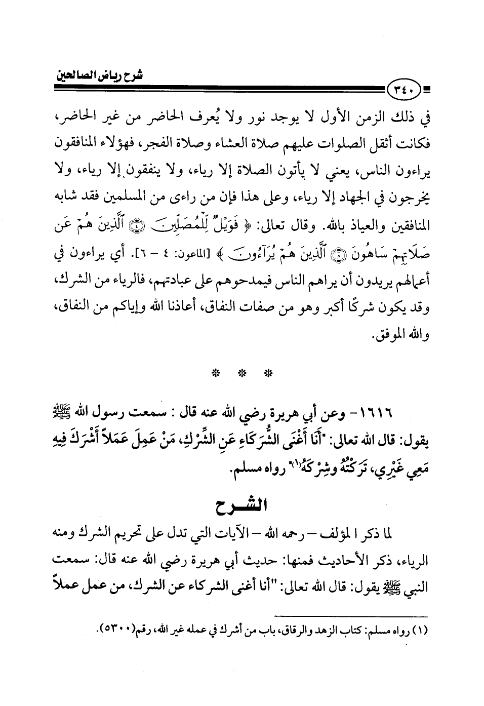 EXلما ذكر المؤلف رحمه الله في رياض الصالحين الآيات التي تدل على تحريم الشرك ومنه الرياء ذكر الأحاديث فمنها حديث أبي هريرة قال: سمعت النبي صلى الله عليه وسلم يقول قال الله تعالى أنا أغنى الشركاء عن الشرك من عمل عملا
