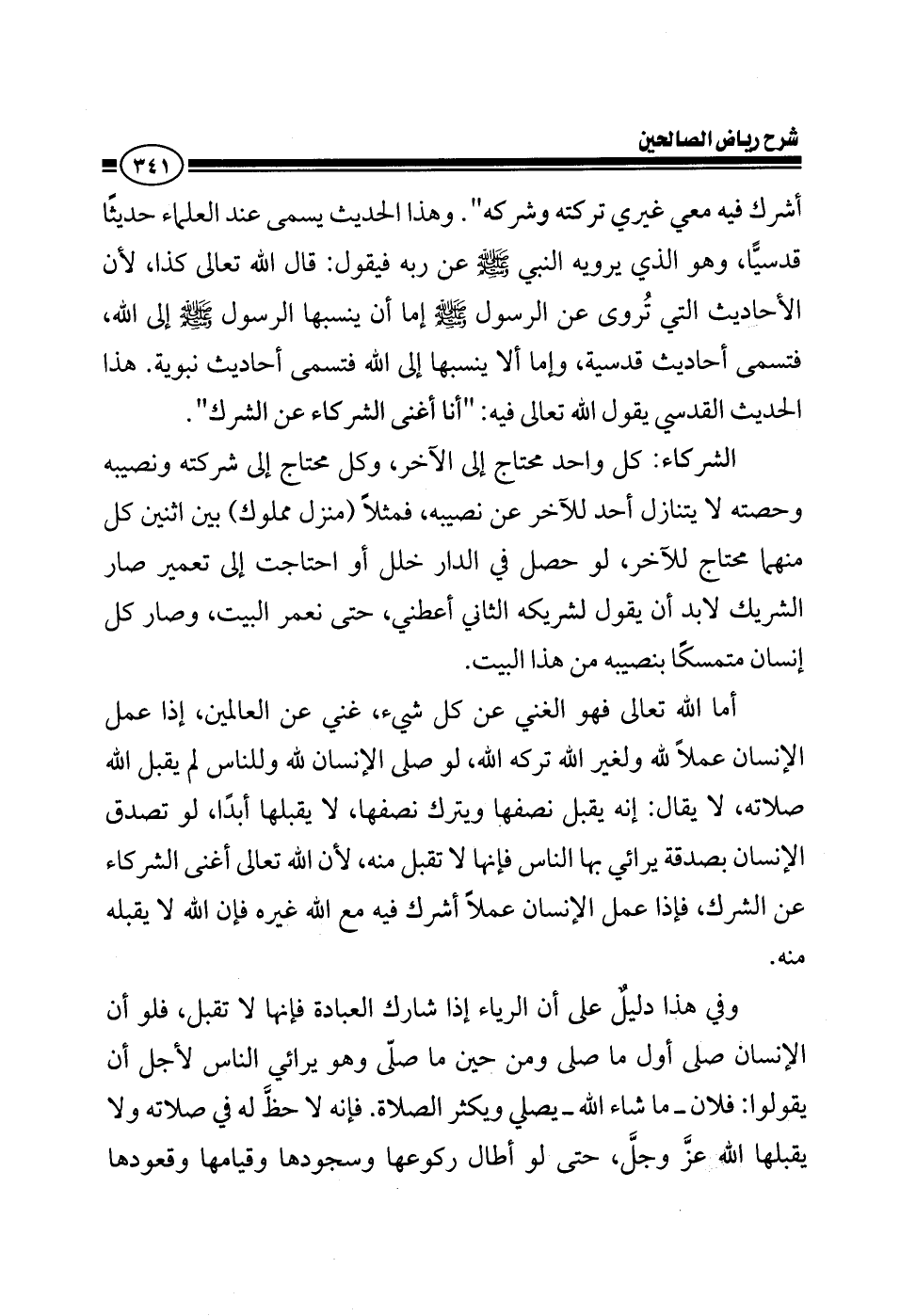 أشرك فيه معي غيري تركته وشركه هذا الحديث يسمى عند العلماء حديث قدسي وهو الذي يرويه النبي صلى الله عليه وسلم عن ربه فيقول قال الله تعالى كذا لأن الأحاديث التي تروى عن الرسول صلى الله عليه وسلم إما أن ينسبها الرسول صلى الله عليه وسلم إلى الله فتسمى أحاديث قدسية وإما ألا ينسبها إلى الله فتسمى أحاديث نبوية هذا الحديث القدسي يقول الله تعالى فيه أنا أغنى الشركاء عن الشرك الشركاء كل محتاج إلى الآخر وكل محتاج إلى شركته ونصيبه وحصته لا يتنازل أحد للآخر عن نصيبه فمثلا دار بين اثنين كل منهما محتاج للآخر لو حصل في الدار خلل أو احتاجت إلى تعمير صار الشريك لابد أن يقول لشريكه الثاني أعطني أعطني نصيبي حتى نعمر البيت وصار كل إنسان متمسكا بنصيبه من هذا البيت أما الله تعالى فهو الغني عن كل شيء غني عن العالمين إذا عمل الإنسان عملا لله ولغير الله تركه الله لو صلى الإنسان لله وللناس لم يقبل الله صلاته لا يقال إنه يقبل نصفها ويترك نصفها أو يقبلها قبولا نصفيا لا لا يقبلها أبدا لو تصدق الإنسان بصدقة يرائي بها الناس فإنها لا تقبل منه لأن الله تعالى أغنى الشركاء عن الشرك إذا عمل الإنسان عملا أشرك فيه مع الله غيره فإن الله لا يقبله منه وفي هذا دليل على أن الرياء إذا شارك العبادة فإنها لا تقبل فلو أن الإنسان صلى أول ما صلى وهو يرائي الناس لأجل أن يقولوا فلان ما شاء الله يتطوع يصلي ويكثر الصلاة فإنه لا حظ له في صلاته ولا يقبلها الله عز وجل حتى لو أطال ركوعها وسجودها وقيامها وقعودها