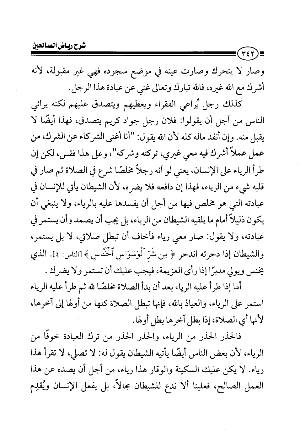 كذلك رجل تصدق صار يمشي على الفقراء ويعطيهم لكنه يرائي الناس من أجل أن يقولوا: فلان والله ما شاء الله رجل جواد كريم يتصدق فهذا أيضا لا يقبل منه وإن أنفد ماله كله لأن الله يقول أنا أغنى الشركاء عن الشرك من عمل عما أشرك فيه معي غيري تركته وشركه وعلى هذا فقس لكن إن طرأ الرياء على الإنسان يعني رجل مخلص شرع في الصلاة ثم صار في قلبه شيء من الرياء فهذا إن دافعه فلا يضره لأن الشيطان يأتي للإنسان في عبادته التي هو مخلص فيها من أجل أن يفسدها عليه بالرياء هذا لا يضر ولا ينبغي أن يكون ذليلا أمام ما يلقيه الشيطان من الرياء بل يجب أن يصمد وأن يستمر في عبادته لا يقول والله أنا صار معي رياء أخاف أن تبطل لا بل يستمر والشيطان إذا دحرته اندحر من شر الوسواس الخناس الذي يخنس ويولي مدبرا إذا رأى العزيمة فأنت أعزم ولا يهمك هذا لا يضرك أما إذا طرأ عليه الرياء بعد أن بدأ الصلاة مخلصا لله ثم طرأ عليه الرياء واستمر استمر على الرياء والعياذ بالله فإنها تبطل الصلاة كلها من أولها إلى أخرها لأنها أي الصلاة إذا بطل آخرها بطل أولها فالحذر الحذر من الرياء والحذر الحذر من ترك العبادة خوفا من الرياء لأن بعض الناس أيضا يأتيه الشيطان يقول له لا تقم تصلي لا تقرأ صار هذا رياء لا يكن عليك السكينة والوقار هذا رياء من أجل ماذا؟ من أجل أن يصده عن هذا العمل الصالح فعلينا ألا ندع للشيطان مجالا يفعل يقدم