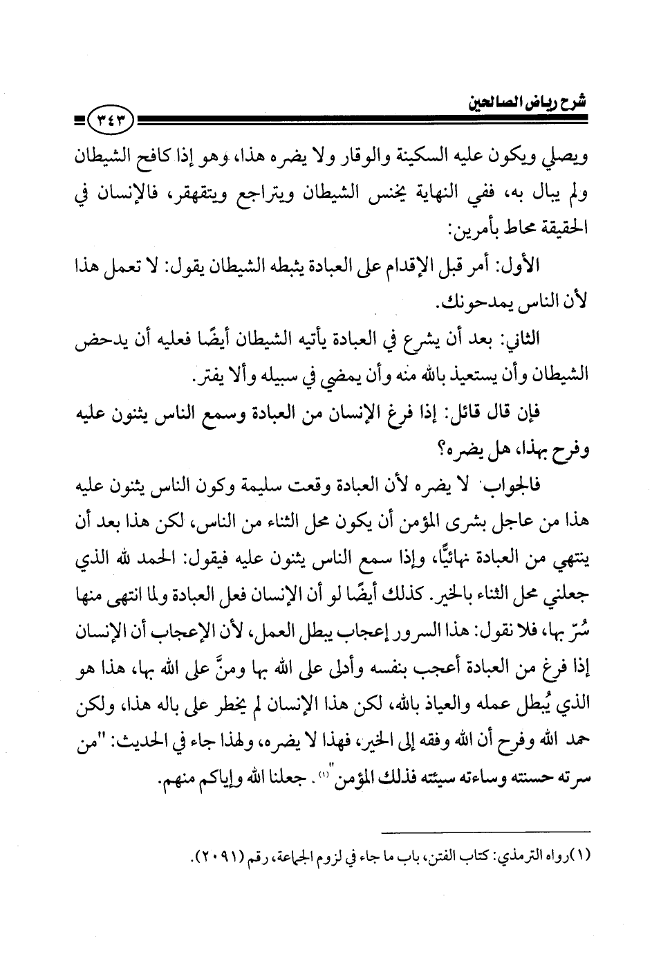 يصلي يكون عليه السكينة والوقار ولا يضرنا هذا وهو إذا كافح الشيطان ولم يبال به ففي النهاية يخنس يخنس الشيطان ويتراجع ويتقهقر فالإنسان في الحقيقة محاط بأمرين أمر قبل الإقدام على العبادة يثبطه الشيطان يقول لا تعمل هذا رياء ترى الناس يمدحونك وأمر ثاني بعد أن يشرع في العبادة يأتيه الشيطان أيضا فعليه أن يدحض الشيطان وأن يستعيذ بالله منه وأن يمض في سبيله وألا يفتر فإن قال قائل إذا فرغ الإنسان من العبادة وسمع الناس يثنون عليه وفرح بهذا هل يضره؟ فالجواب لا يضره لأن العبادة وقعت سليمة وكون الناس يثنون عليه هذا من عاجل بشرى المؤمن أن يكون محل الثناء من الناس لكن هذا بعد أن ينتهي من العبادة نهائيا سمع الناس يثنون عليه يقول الحمد لله الذي جعلني محل الثناء بالخير كذلك أيضا لو أن الإنسان فعل العبادة ولما انتهى منها سر بها فهل نقول هذا السرور إعجاب يبطل العمل؟ لا ما يضره لأن الإعجاب أن الإنسان إذا فرغ من العبادة أعجب بنفسه وأبلي على الله بها ومن على الله بها، هذا هو الذي يبطل عمله والعياذ بالله، لكن هذا الإنسان ما خطر على باله هذا، ولكن حمد الله وفرح أن الله وفقه إلى الخير، هذا لا يضره، ولهذا جاء في الحديث: من سرته حسنته وساءته سيئته فذلك المؤمن جعلنا الله وإياكم منهم