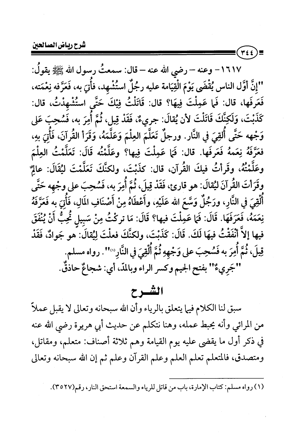 1617 - وعنه قال سمعت رسول الله صلى الله عليه وسلم يقول: إن أول الناس يقضي يوم القيامة عليه رجل استشهد فأتى به فعرفه نعمته فعرفها قال فما علمت فيها قال قاتلت فيك حتى استشهدت قال كذبت ولكنك قاتلت لأن يقال جريء فقد قيل ثم أمر به فسحب على وجهه حتى ألقى في النار ورجل تعلم العلم وعلمه وقرأ القرآن فأتى به فعرفه نعمه فعرفها قال فما عملت فيها قال تعلمت العلم وعلمته وقرأت فيك القرآن قال كذبت ولكنك تعلمت العلم وعلمته وقرأت القرآن ليقال هو قارئ فقد قيل ثم أمر فسحب على وجهه حتى ألقي في النار ورجل وسع الله عليه وأعطاه من أصناف المال فأتي به فعرفه نعمه فعرفها قال فما عملت فيها؟ قال: ما تركت من سبيل تحب أن ينفق فيها إلا أنفقت فيها لك قال: كذبت ولكنك فعلت ليقال هو جواد فقد قيل ثم أمر به فسحب على وجهه ثم ألقي في النار رواه مسلم جريء بفتح الجيم وكسر الراء وبالمد أي: شجاع حاذق