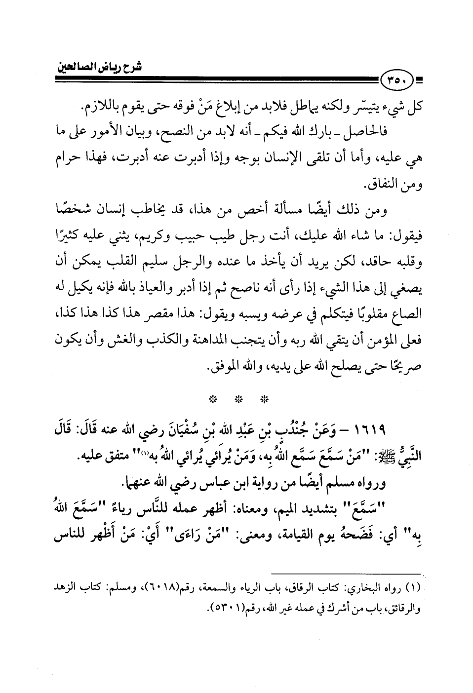 1619 - وعن جندب بن عبد الله بن سفيان رضي الله عنه قال: قال النبي صلى الله عليه وسلم: من سمع سمع الله به، ومن يرائي الله يرئي به متفق عليه ورواه مسلم أيضاً من رواية ابن عباس رضي الله عنهما سمع بتشديد الميم، ومعناه: أشهر عمله للناس رياء سمع الله به أي: فضحه يوم القيامة، ومعنى من راءى أي من أظهر للناس
