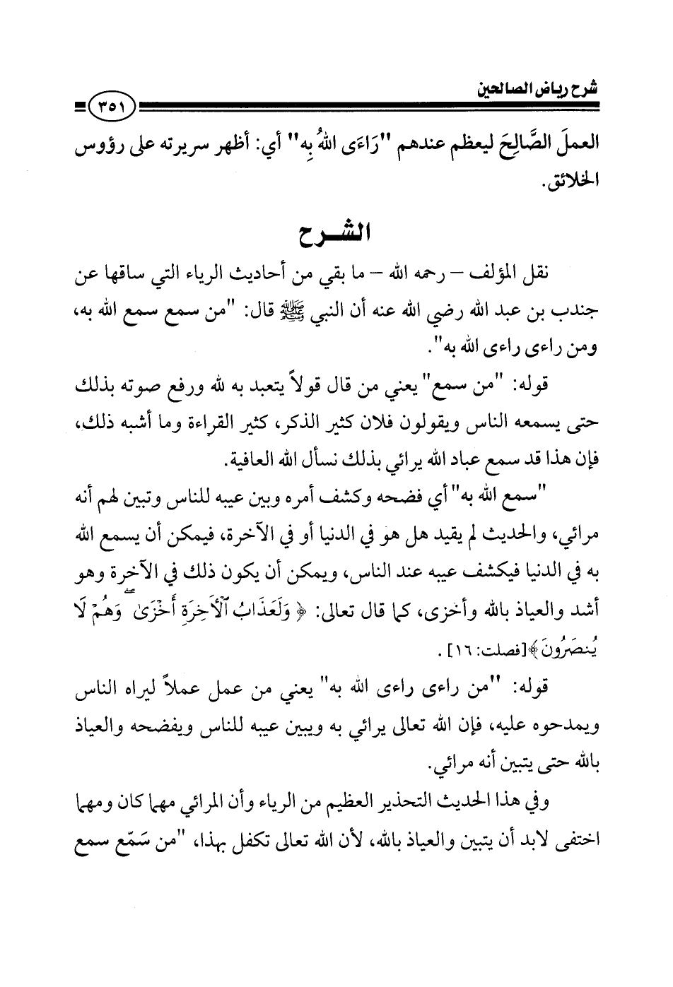 EXنقل المؤلف رحمه ما بقي من أحاديث الرياء التي سبقت، عن جندب بن عبد الله رضي الله عنه أن النبي صلى الله عليه وسلم قال: من سمع سمع الله به، ومن راءى راءى الله به يعني من قال قولا يتعبد به الله ورفع صوته بذلك حتى يسمعه الناس ويقولون فلان كثير الذكر كثير القراءة وما أشبه ذلك فإن هذا قد سمع عباد الله يرائي بذلك نسأل الله العافية سمع الله به أي فضحه وكشف أمره وبين عيبه للناس وتبين لهم أنه مرائي والحديث لم يقيد هل هو في الدنيا أو في الآخرة فيمكن أن يسمع الله به في الدنيا فيكشف عيبه عند الناس ويمكن أن يكون ذلك في الآخرة وهو أشد والعياذ بالله وأخزى كما قال الله تعالى ولعذاب الآخرة أخزى وهم لا ينصرون وكذلك من راءى راءى الله به يعني من عمل عملا ليراه الناس ويمدحوه عليه فإن الله تعالى يرائي به ويبين عيبه للناس ويفضحه والعياذ بالله حتى يتبين أنه يرائي وفي هذا الحديث التحذير العظيم من الرياء وأن المرائي مهما كان ومهما اختفى لابد أن يتبين والعياذ بالله لأن الله تعالى تكفل بهذا من سمع سمع