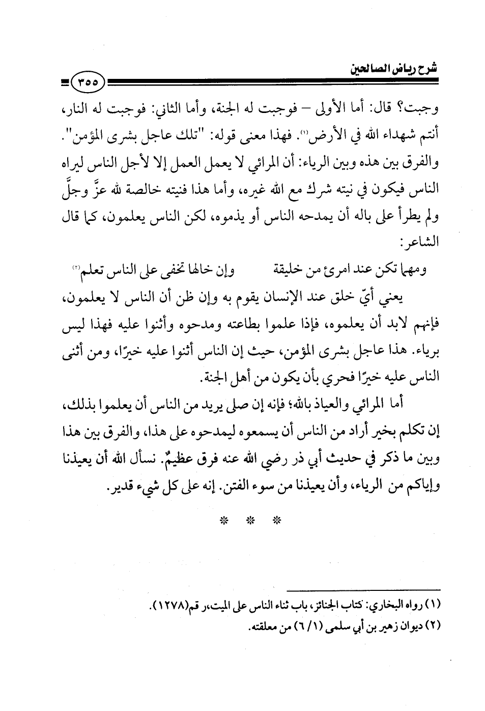 وجبت قال أما الأول فوجبت له الجنة وأما الثاني فوجبت له النار أنتم شهداء الله في الأرض فهذا معنى قوله تلك عاجل بشرى المؤمن والفرق بين هذه وبين الرياء أن المرائي لا يعمل العمل إلا لأجل الناس ليراه الناس فيكون في نيته شرك شرك مع الله غيره وأما هذا فنيته خالصة لله عز وجل ولم يطرأ على باله أن يمدحه الناس أو يذموه لكن الناس يعلمون كما قال الشاعر