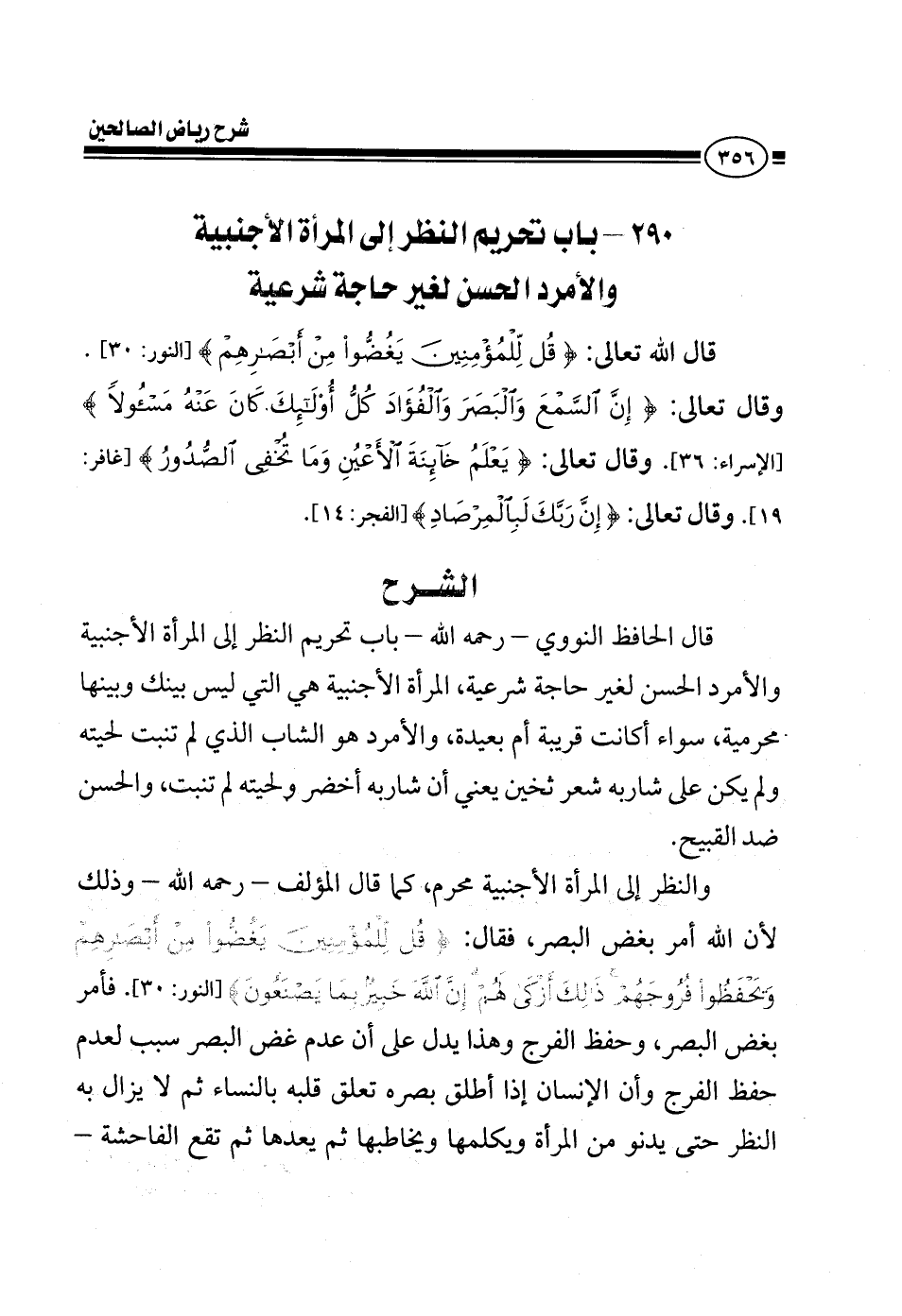EXقال النووي رحمه الله في كتابه رياض الصالحين باب تحريم النظر إلى المرأة الأجنبية والأمرد الحسن لغير حاجة المرأة الأجنبية هي التي ليس بينك وبينها محرمية سواء أكانت قريبة أم بعيدة والأمرد هو الشاب الذي لم تنبت لحيته ولم يكن على شاربه شعر ثخين يعني أن شاربه أخضر ولحيته لم تنبت والحسن ضد القبيح النظر إلى المرأة الأجنبية محرم كما قال المؤلف رحمه الله وذلك لأن الله أمر بغض البصر فقال قل للمؤمنين يغضوا من أبصارهم ويحفظوا فروجهم ذلك أزكى لهم إن الله خبير بما يصنعون فأمر بغض البصر وحفظ الفرج وهذا يدل على أن عدم غض البصر سبب لعدم حفظ الفرج وأن الإنسان إذا أطلق بصره تعلق قلبه بالنساء ثم لا يزال به النظر حتى يدنو من المرأة ويكلمها ويخاطبها ثم يعدها ثم تحصل الفاحشة