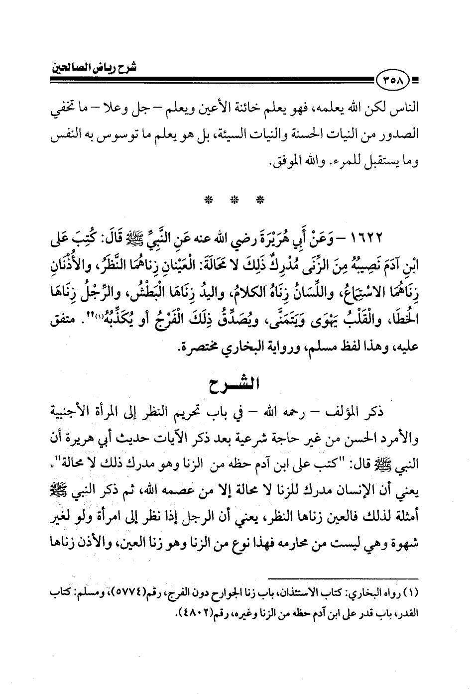 1622 - وعن أبي هريرة رضي الله عنه عن النبي صلى الله عليه وسلم قال: كتب على ابن آدم نصيبه من الزنا مدرك ذلك لا محالة العينان زناهما النظر والأذنان زناهما الاستماع واللسان زناه الكلام واليد زناها البطش والرجل زناها الخطا والقلب يهوى ويتمنى ويصدق ذلك الفرج أو يكذبه متفق عليه وهذا لفظ مسلم ورواية البخاري مختصرة.