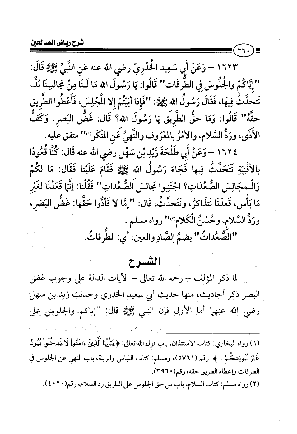 1623 - وعن أبي سعيد الخدري رضي الله عنه عن النبي صلى الله عليه وسلم قال إياكم والجلوس في الطرقات قالوا يا رسول الله ما لنا من مجالسنا بد نتحدث فيها فقال رسول الله صلى الله عليه وسلم فإذا أبيتم إلا المجلس فأعطوا الطريق حقه قالوا وما حق الطريق يا رسول الله قال غض البصر وكف الأذى ورد السلام والأمر بالمعروف والنهي عن المنكر متفق عليه.