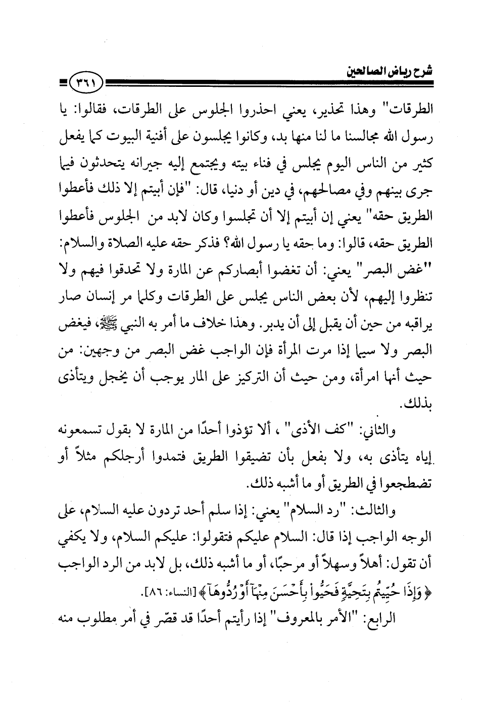 الطرقات وهذا تحذير يعني احذروا الجلوس على الطرقات فقالوا يا رسول الله مجالسنا ما لنا منها بد وكانوا يجلسون على أفنية البيوت كما يفعل كثير من الناس اليوم يجلس في فناء بيته ويجتمع إليه جيرانه يتحدثون فيما جرى بينهم وفي مصالحهم في دين أو دنيا قال فإن أبيتم إلا ذلك فأعطوا الطريق حقه يعني إن أبيتم إلا أن تجلسوا وكان لابد من الجلوس فأعطوا الطريق حقه قالوا وما حقه يا رسول الله فذكر حقه عليه الصلاة والسلام غض البصر يعني أن تغضوا أبصاركم عن المارة ولا تحدقوا فيهم ولا تنظروا إليهم لأن بعض الناس يجلس على الطرقات وكلما مر إنسان صار يراقبه من حين أن يقبل إلى أن يدبر وهذا خلاف ما أمر به النبي صلى الله عليه وسلم فيغض البصر ولاسيما إذا مرت المرأة فإن الواجب غض البصر من وجهين من حيث أنها امرأة ومن حيث إن التركيز على المار يوجب أن يخجل ويتأذى بذلك الثاني كف الأذى ألا تؤذوا أحدا من المارة لا بقول ولا بفعل لا بقول تسمعونه إياه يتأذى به ولا بفعل بأن تضيقوا الطريق فتمدوا أرجلكم مثلا أو تضجعوا في الطريق أو ما أشبه ذلك والثالث رد السلام يعني إذا سلم أحد تردون عليه السلام على الوجه الواجب إذا قال السلام عليكم تقول عليكم السلام ولا يكفي أن تقول أهلا وسهلا أو مرحبا أو ما أشبه ذلك بل لابد من الرد الواجب وإذا حييتم بتحية فحيوا بأحسن منها أو ردوها الرابع الأمر بالمعروف إذا رأيتم أحدا قد قصر في أمر مطلوب منه
