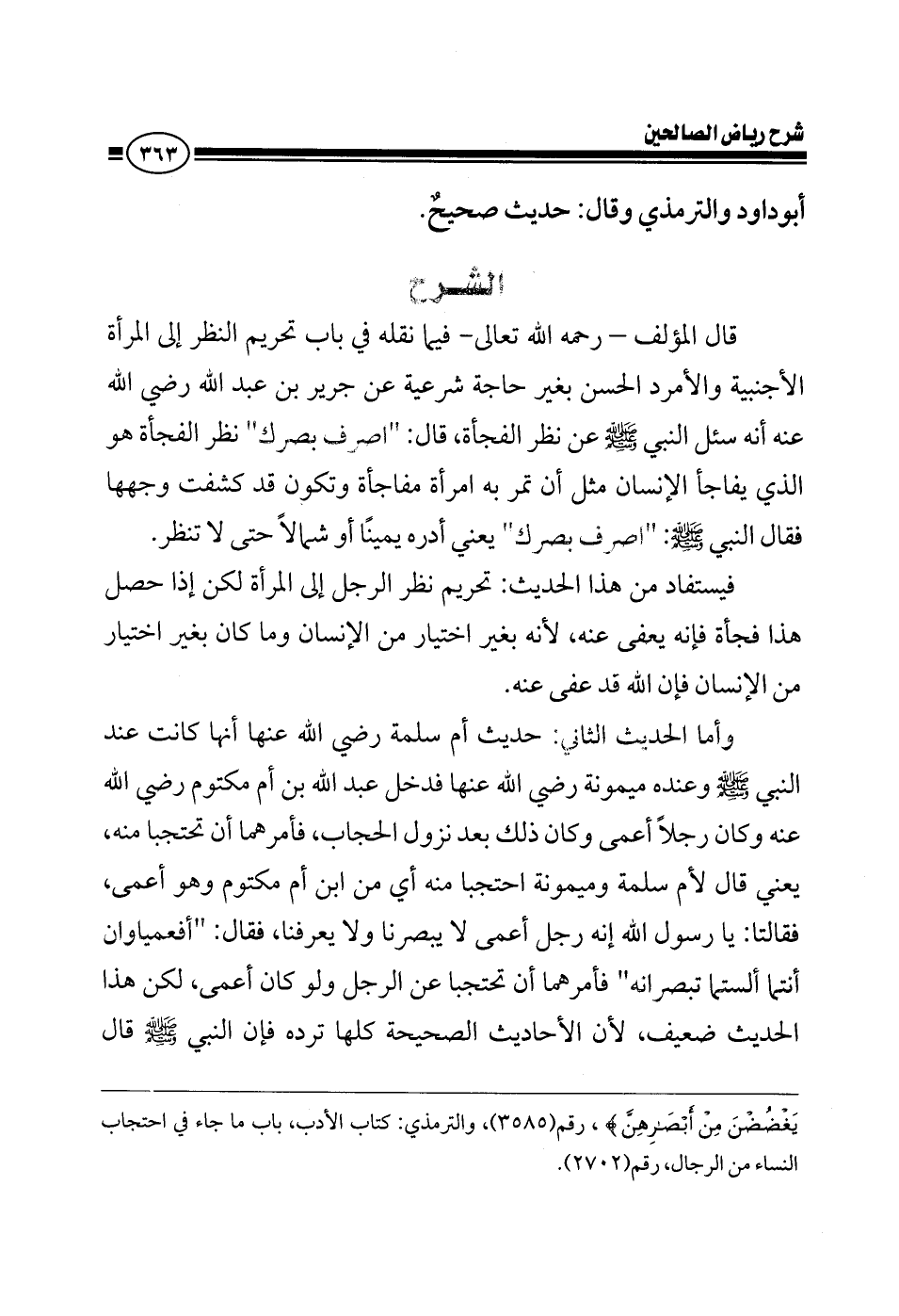 EXقال المؤلف رحمه الله تعالى فيما نقله في كتابه رياض الصالحين في باب تحريم النظر إلى المرأة الأجنبية والأمرد الحسن بغير حاجة شرعية عن جرير بن عبد الله رضي الله عنه أنه سئل النبي صلى الله عليه وسلم عن نظرة الفجأة قال اصرف بصرك نظر الفجأة هو الذي يفاجأ الإنسان مثل أن تمر به امرأة مفاجأة وتكون قد كشفت وجهها فقال النبي صلى الله عليه وسلم اصرف بصرك يعني أدره يمينا أو شمالا حتى لا تنظر فيستفاد من هذا الحديث تحريم نظر الرجل إلى المرأة لكن إذا حصل هذا فجأة فإنه يعفى عنه لأنه بغير اختيار من الإنسان وما كان بغير اختيار من الإنسان فإن الله قد عفى عنه وأما الحديث الثاني حديث أم سلمة أنها كانت عند النبي صلى الله عليه وسلم وعنده ميمونة فدخل عبد الله ابن أم مكتوم وكان رجل أعمى وكان ذلك بعد نزول الحجاب فأمرهما أن تحتجبا منه يعني قال لأم سلمة وميمونة احتجبا منه يعني من ابن أم مكتوم وهو أعمى فقالتا يا رسول الله إنه رجل أعمى لا يبصرنا ولا يعرفنا فقال: أفعمياوان أنتما احتجبا منه فأمرهما أن تحتجبا عن الرجل ولو كان أعمى لكن هذا الحديث ضعيف لأن الأحاديث الصحيحة كلها ترده فإن النبي صلى الله عليه وسلم قال