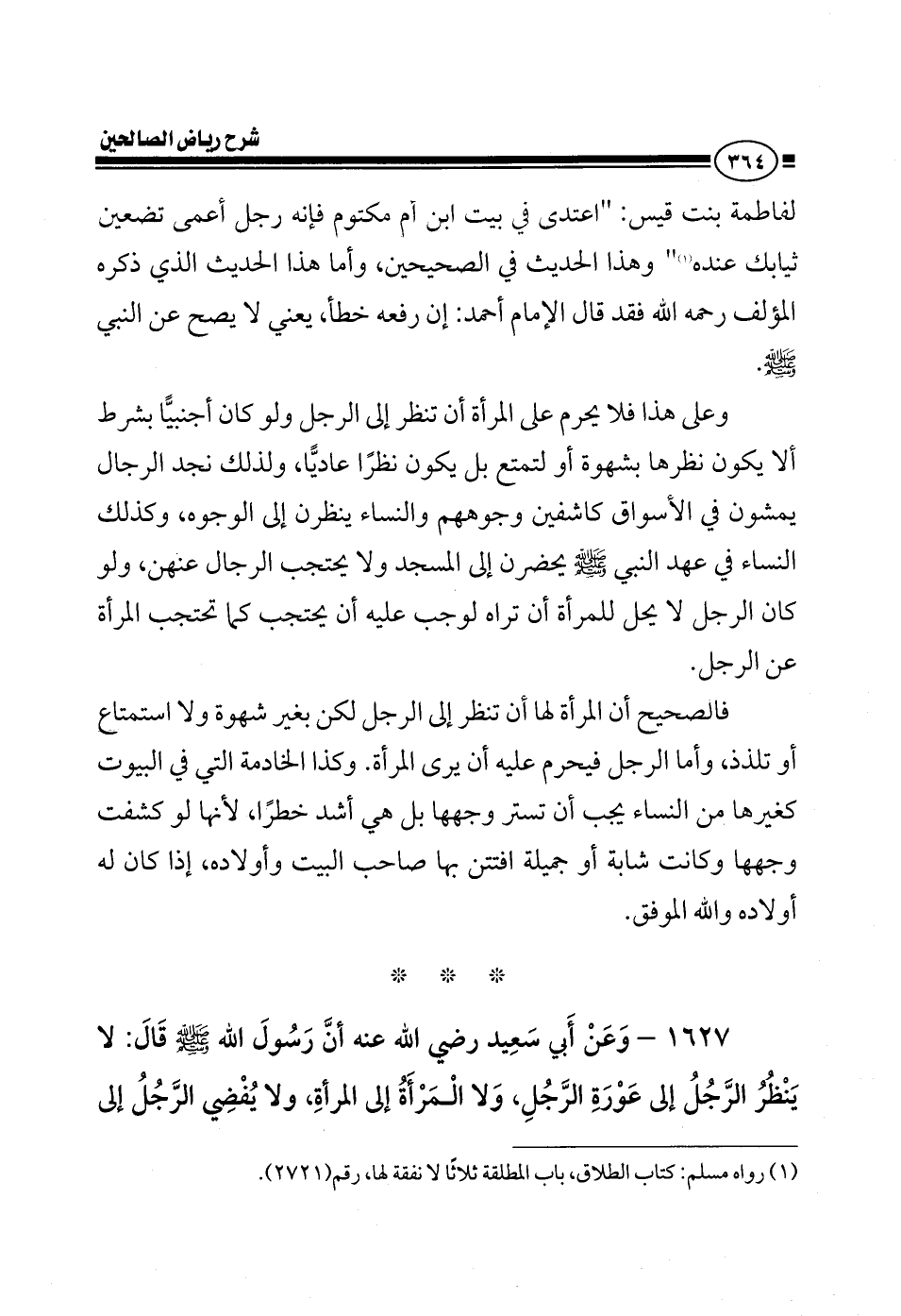 لفاطمة بنت قيس: اعتدي في بيت ابن أم مكتوم فإنه رجل أعمى تضعين ثيابك عنده وهذا الحديث في الصحيحين وأما هذا الحديث الذي ذكره المؤلف رحمه الله فقد قال الإمام أحمد إن رفعه خطأ يعني لا يصح عن النبي صلى الله عليه وسلم وعلى هذا فلا يحرم على المرأة أن تنظر إلى الرجل ولو كان أجنبي بشرط ألا يكون نظرها بشهوة أو لتمتع يعني نظر عادي ولذلك نجد الرجال يمشون في الأسواق كاشفين وجوههم والنساء ينظرون إلى الوجوه وكذلك النساء في عهد النبي صلى الله عليه وسلم يحضرن إلى المسجد ولا يحتجب الرجال عنهن ولو كان الرجل لا يحل للمرأة أن تراه لوجب عليه أن يحتجب كما تحتجب المرأة عن الرجل فالصحيح أن المرأة لها أن تنظر من الرجل لكن بغير شهوة ولا استمتاع أو تلذذ وأما الرجل فيحرم عليه أن يرى المرأة كما مر علينا الآن وكما مر علينا فيما سبق وأما الحديث الأخير فحديث أبي سعيد الخدري رضي الله عنه أن النبي صلى الله عليه وسلم قال: لا تنظر المرأة إلى عورة المرأة ولا الرجل إلى عورة الرجل ولا يفضي الرجل إلى