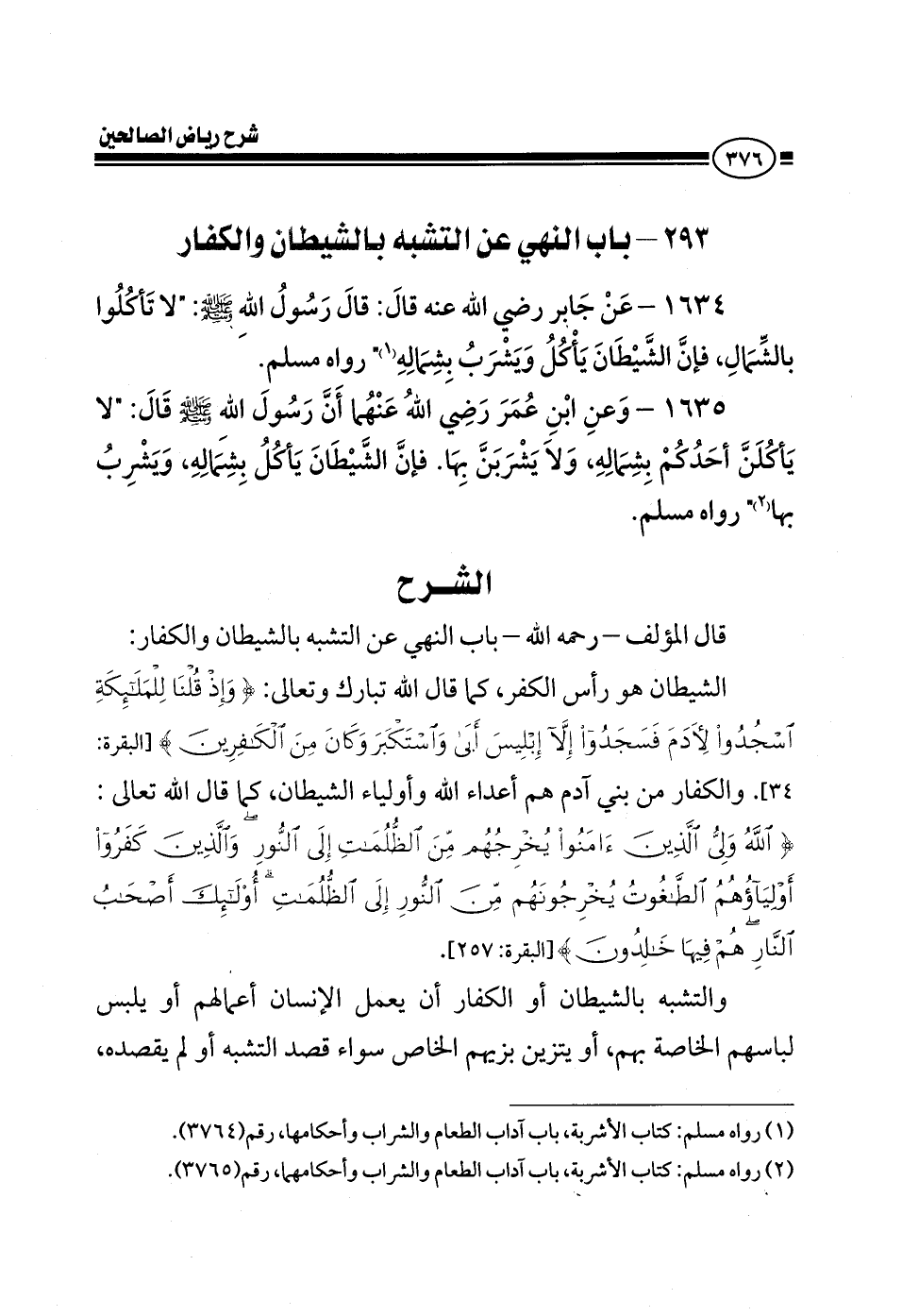 EXقال المؤلف في كتابه رياض الصالحين باب تحريم التشبه بالشيطان والكفار الشيطان هو رأس الكفر كما قال الله تعالى وَإِذْ قُلْنَا لِلْمَلَائِكَةِ اسْجُدُوا لِآدَمَ فَسَجَدُوا إِلَّا إِبْلِيسَ أَبَى وَاسْتَكْبَرَ وَكَانَ مِنَ الْكَافِرِينَ والكفار من بني آدم هم أعداء الله وأولياء الشيطان كما قال الله تعالى {اللَّهُ وَلِيُّ الَّذِينَ آمَنُوا يُخْرِجُهُمْ مِنَ الظُّلُمَاتِ إِلَى النُّورِ وَالَّذِينَ كَفَرُوا أَوْلِيَاؤُهُمُ الطَّاغُوتُ يُخْرِجُونَهُمْ مِنَ النُّورِ إِلَى الظُّلُمَاتِ أُولَئِكَ أَصْحَابُ النَّارِ هُمْ فِيهَا خَالِدُونَ} والتشبه بالشيطان أو الكفار أن يعمل الإنسان أعمالهم أو يلبس لباسهم الخاص بهم أو يتزين بزيهم الخاص سواء قصد التشبه أو لم يقصده