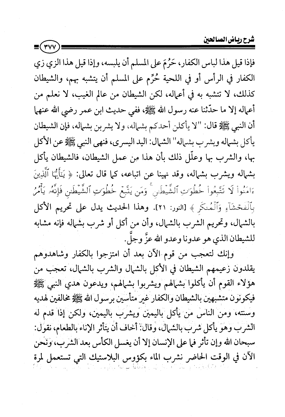 حرم على المسلم أن يتشبه بهم الشيطان كذلك لا يتشبه به في أعماله لكن الشيطان من عالم الغيب لا نعلم من أعماله إلا ما حدثنا عنه رسول الله صلى الله عليه وسلم ففي حديث ابن عمر رضي الله عنهما أن النبي صلى الله عليه وسلم قال لا يأكلن أحدكم بشماله ولا يشربن بشماله فإن الشيطان يأكل بشماله ويشرب بشماله الشمال اليد اليسرى فنهى النبي صلى الله عليه وسلم عن الأكل بها والشرب بها وعلل ذلك بأن هذا عمل الشيطان الشيطان يأكل بشماله ويشرب بشماله وقد نهينا عن اتباعه كما قال تعالى {يَا أَيُّهَا الَّذِينَ آمَنُوا لَا تَتَّبِعُوا خُطُوَاتِ الشَّيْطَانِ وَمَنْ يَتَّبِعْ خُطُوَاتِ الشَّيْطَانِ فَإِنَّهُ يَأْمُرُ بِالْفَحْشَاءِ وَالْمُنْكَرِ} وهذا الحديث يدل على تحريم الأكل بالشمال وتحريم الشرب بالشمال وأن من أكل أو شرب بشماله فإنه مشابهة للشيطان الذي هو عدونا وعدو الله عز وجل وإنك لتعجب من قوم الآن بعد أن امتزجوا بالكفار وشاهدوهم يقلدون زعيمهم الشيطان في الأكل بالشمال والشرب بالشمال تعجب من هؤلاء القوم أن يأكلوا بشمالهم ويشربوا بشمالهم ويدع هدى النبي صلى الله عليه وسلم فيكونون متشبهين بالشيطان والكفار غير متأسين برسول الله صلى الله عليه وسلم مخالفين لهديه وسننه ومن الناس من يأكل باليمين ويشرب باليمين ولكن إذا قدم له الشرب وهو يأكل شرب بالشمال وقال أخاف أن يتلطخ الإناء سبحان الله وإن تلطخ الإناء يتلطخ بنجاسة أو بطعام بطعام والطعام حلال وما على الإنسان إلا أن يغسل الكأس بعد الشرب ونحن الآن في الوقت الحاضر نشرب الكأس الباغ ويرمى