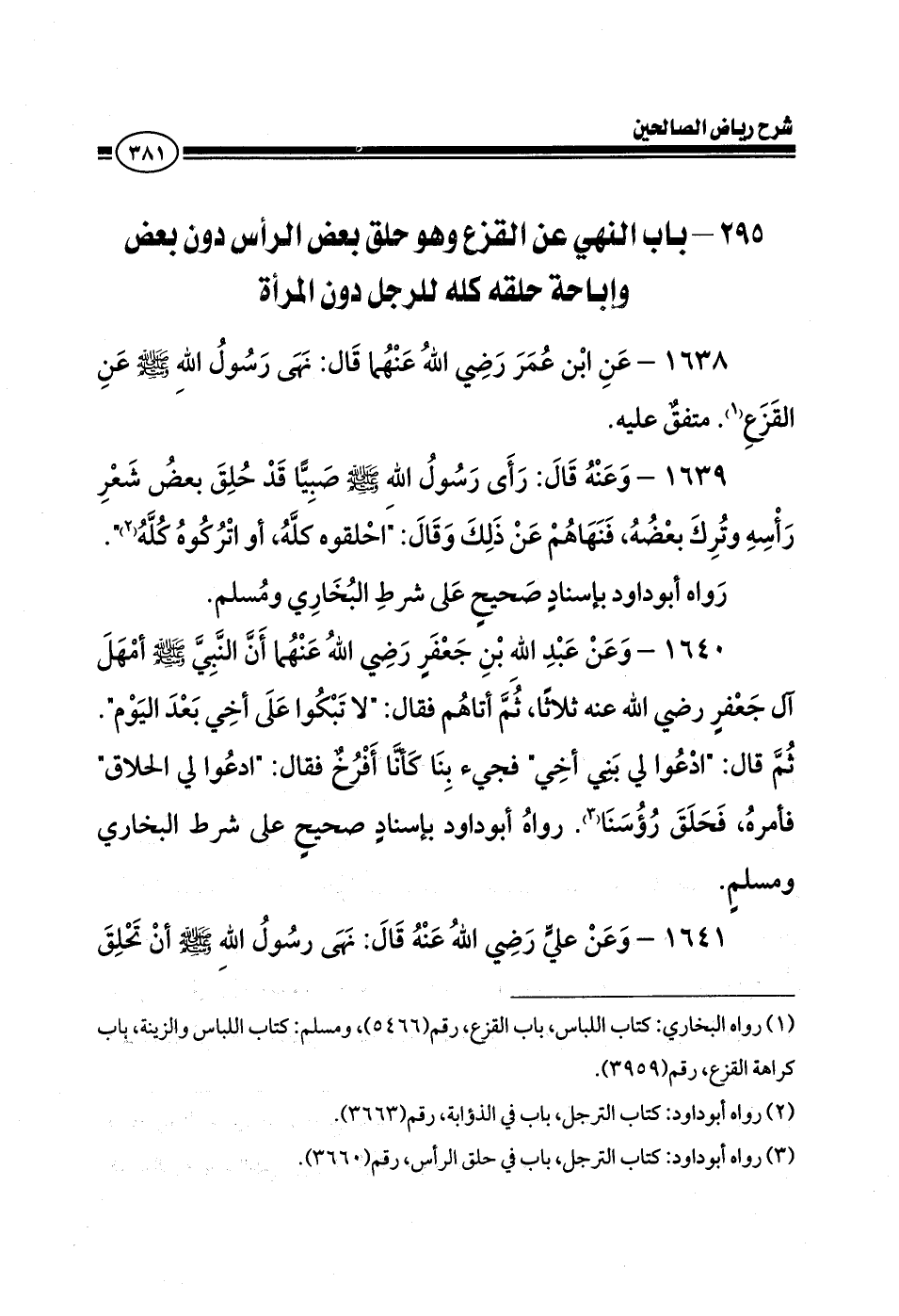 1639 - وعنه رضي الله عنه قال: رأى رسول الله صلى الله عليه وسلم صبيا قد حلق بعض شعر رأسه وترك بعضه فنهاهم عن ذلك وقال احلقوه كله أو اتركوه كله رواه أبو داود بإسناد صحيح على شرط البخاري ومسلم