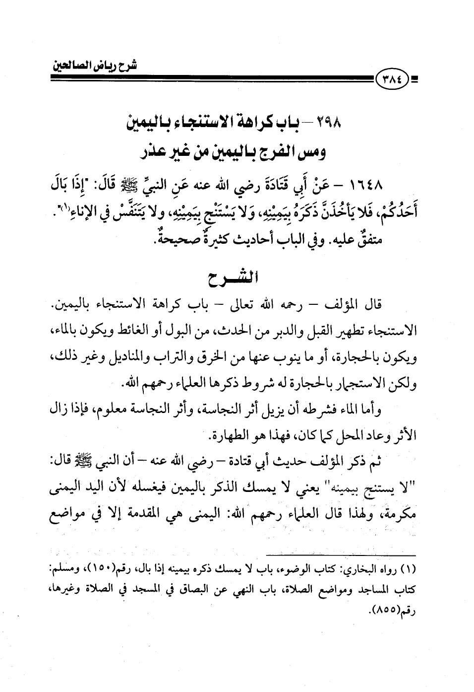 1648 - عن أبي قتادة رضي الله عنه عن النبي صلى الله عليه وسلم قال إذا بال أحدكم فلا يأخذن ذكره بيمينه ولا يستنج بيمينه ولا يتنفس في الإناء متفق عليه وفي الباب أحاديث كثيرة صحيحة