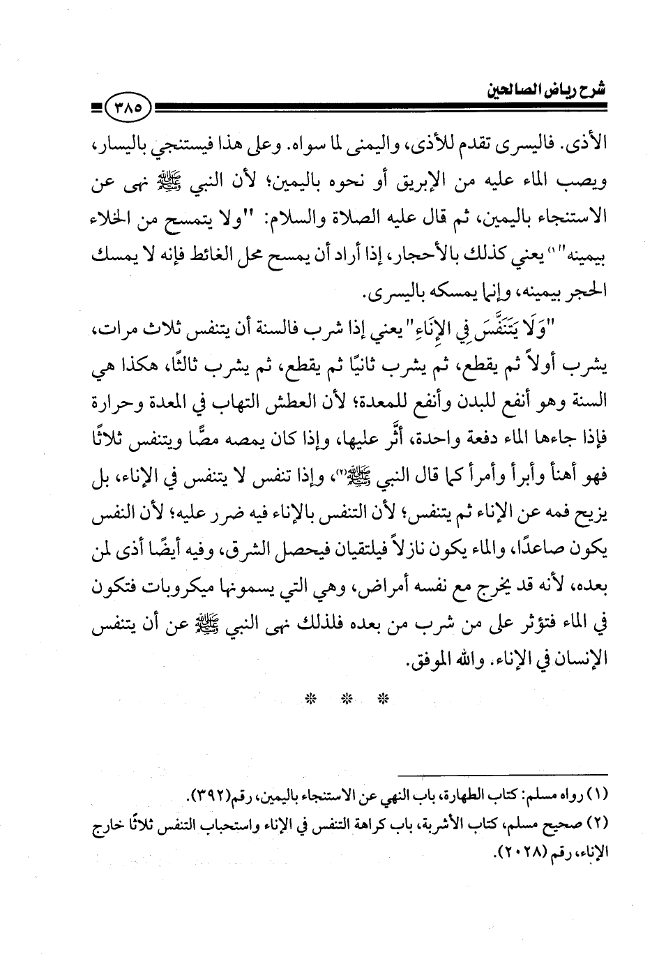 الأذى فاليسرى تقدم للأذى واليمنى لما سواه وعلى هذا فيستنجي باليسار ويصب الماء باليمين لأن النبي صلى الله عليه وسلم نهى عن الاستنجاء باليمين ثم قال عليه الصلاة والسلام ولا يتمسح من الخلاء بيمينه يعني كذلك بالأحجار إذا أراد أن يمسح محل الغائط فإنه لا يمسك الحجر بيمينه وإنما يمسكه باليسرى ولا يتنفس في الإناء يعني إذا شرب فالسنة أن يتنفس ثلاث مرات يشرب أولا ثم يقطع ثم يشرب ثانيا ثم يقطع ثم يشرب ثالثا هكذا هي السنة وهو أنفع للبدن وأنفع للمعدة لأن العطش التهاب في المعدة وحرارة فإذا جاءها الماء دفعة واحدة أثر عليها وإذا كان يمصه مصا ويتنفس ثلاثا فهو أهنأ وأبرأ وأمرأ كما قال النبي صلى الله عليه وسلم لكن إذا تنفس لا يتنفس في الإناء يزيل فمه عن الإناء ثم يتنفس لأن التنفس بالإناء فيه ضرر على الشارب لأن النفس يكون صاعدا والماء يكون نازلا فيلتقيان فيحصل الشرق وفيه أيضا أذى لمن بعده لأنه يخرج مع نفسه أمراض التي يسمونها ميكروبات فتكون في الماء فتؤثر على من شرب من بعده فلذلك نهى النبي صلى الله عليه وسلم عن أن يتنفس الإنسان في الإناء والله الموفق