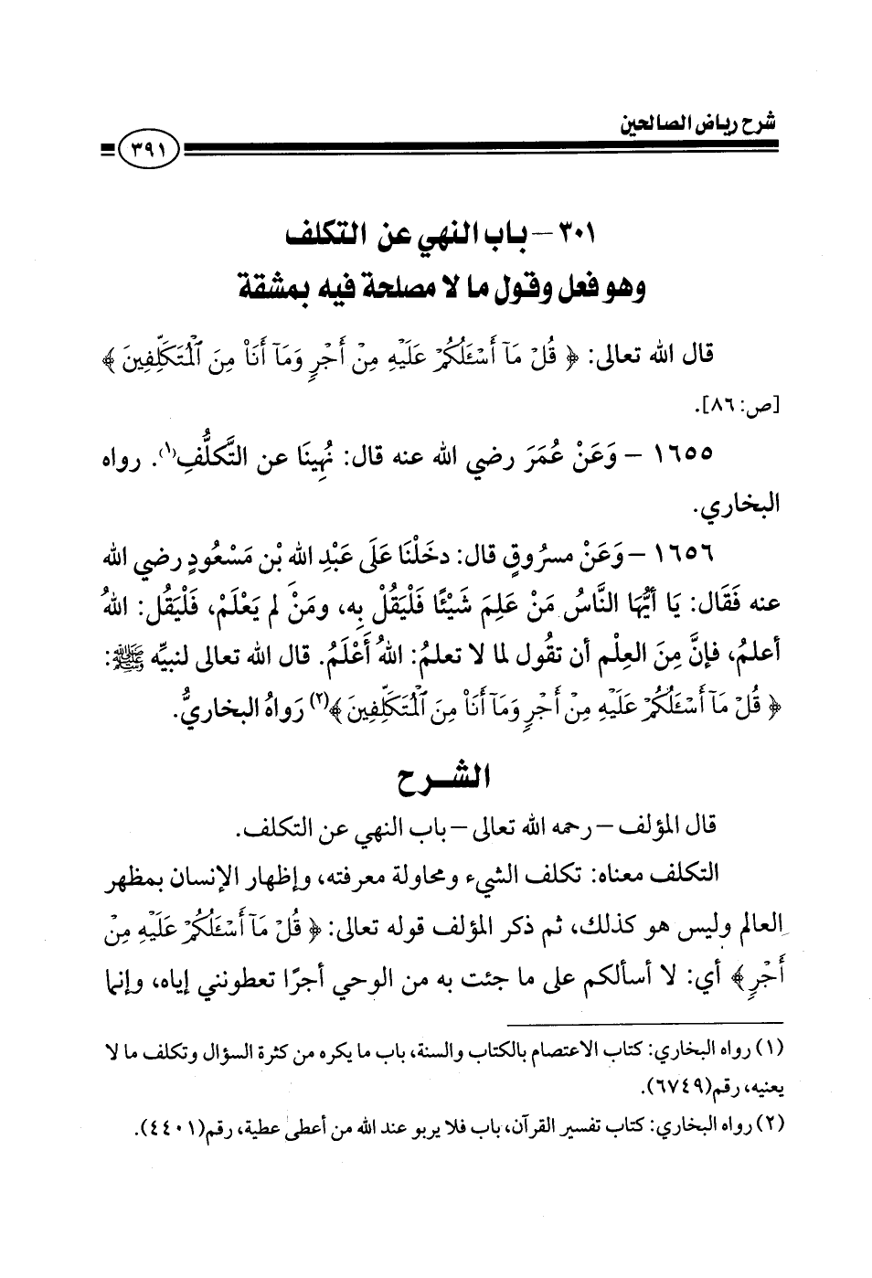 EXقال المؤلف رحمه الله تعالى في كتابه رياض الصالحين باب النهي عن التكلف التكلف معناه تكلف الشيء ومحاولة معرفته وإظهار الإنسان بمظهر العالم وليس كذلك ثم ذكر المؤلف قوله تعالى قُلْ مَا أَسْأَلُكُمْ عَلَيْهِ مِنْ أَجْرٍ أي لا أسألكم على ما جئت به من الوحي أجرا تعطونني إياه وإنما