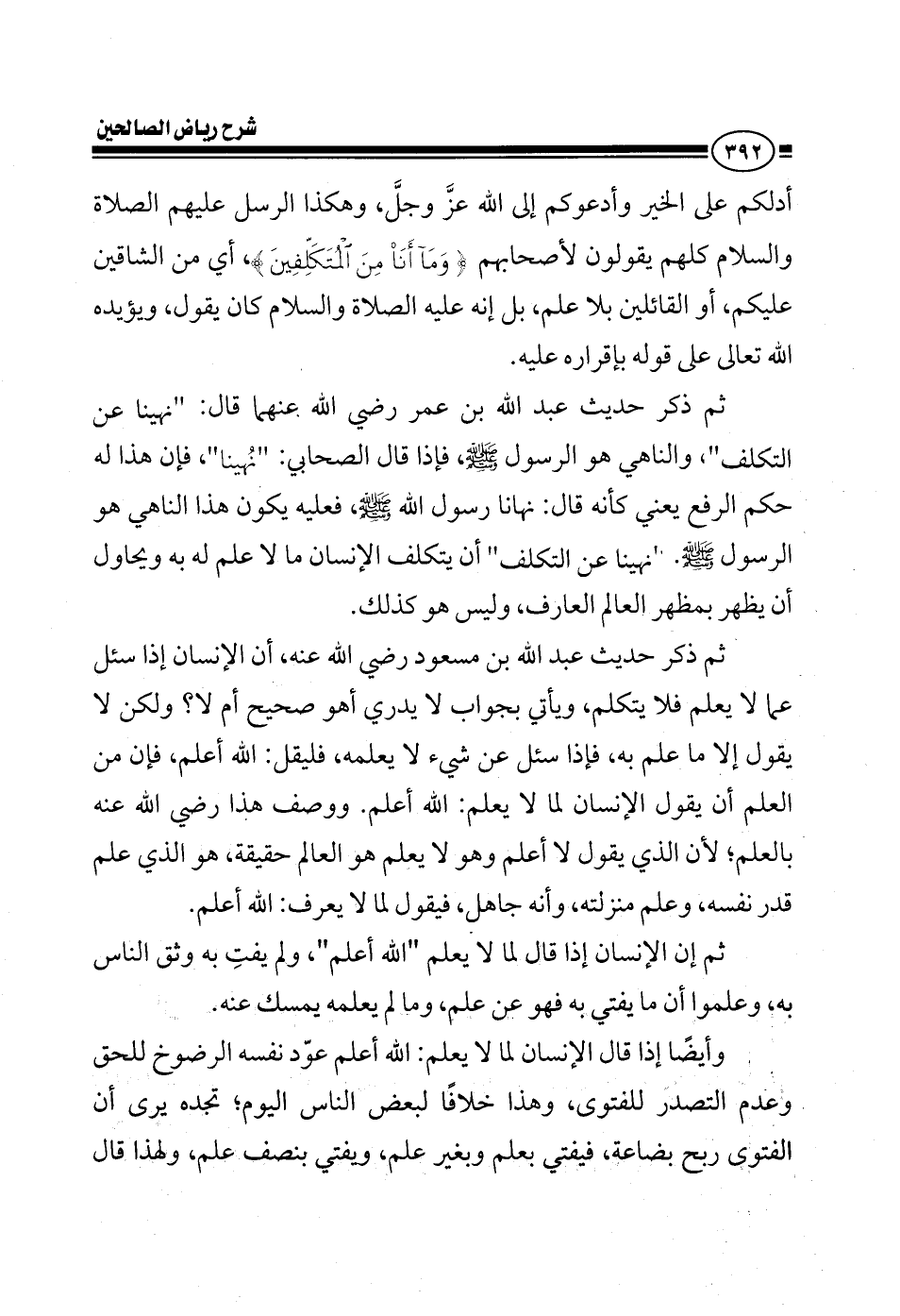 أدلكم على الخير وأدعوكم إلى الله عز وجل وهكذا الرسل عليهم الصلاة والسلام كلهم يقولون لأصحابهم {قُلْ مَا أَسْأَلُكُمْ عَلَيْهِ مِنْ أَجْرٍ وَمَا أَنَا مِنَ الْمُتَكَلِّفِينَ} أي من الشاقين عليكم أو القائلين بلا علم بل إنه عليه الصلاة والسلام كان يقول ويؤيده الله على قوله بإقراره عليه ثم حديث عبد الله بن عمر رضي الله عنهما قال نهينا عن التكلف والناهي هو الرسول صلى الله عليه وسلم فإذا قال الصحابي نهينا فإن هذا له حكم الرفع يعني كأنه قال نهانا رسول الله صلى الله عليه وسلم فعليه يكون هذا الناهي هو الرسول صلى الله عليه وسلم نهينا عن التكلف أن يتكلف الإنسان ما لا علم له به ويحاول أن يظهر بمظهر العالم العارف وليس كذلك ثم ذكر حديث عبد الله بن مسعود رضي الله عنه أن الإنسان إذا سئل عما لا يعلم فلا يتكلم ويأتي بجواب لا يدري أهو صحيح أم لا ولكن لا يقول إلا ما علم به فإذا سئل عن شيء لا يعلمه فليقل الله أعلم فإن من العلم أن يقول الإنسان لما لا يعلم الله أعلم ووصف هذا رضي الله عنه بالعلم لأن الذي يقول لا أعلم وهو لا يعلم هو العالم حقيقة هو الذي علم قدر نفسه وعلم منزلته وأنه جاهل فيقول لما لا يعرف الله أعلم ثم أن الإنسان إذا قال لما لا يعلم الله أعلم ولم يفت به يثق الناس به ويعلمون أن ما أفتى به فهو عن علم وما لم يعلمه يمسك عنه وأيضا إذا قال الإنسان لما لا يعلم الله أعلم عود نفسه الرضوخ للحق وعدم التصدر للفتوى وهذا خلافا لبعض الناس اليوم تجده يرى أن الفتوى ربح بضاعة فيفتي بعلم وبغير علم ويفتي بنصف علم ولهذا قال