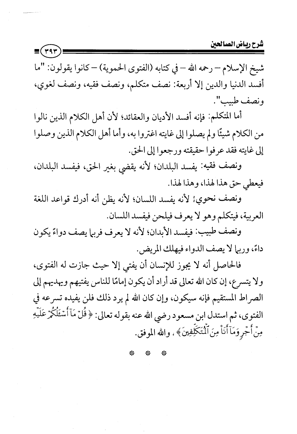 شيخ الإسلام رحمه الله في كتابه الفتوى الحموية كانوا يقولون ما أفسد الدنيا والدين إلا أربعة نصف متكلم نصف فقيه نصف لغوي نصف طبيب أما المتكلم فإنه أفسد الأديان والعقائد لأن أهل الكلام الذين نالوا من الكلام شيئا ولم يصلوا إلى غايته اغتروا به وأما أهل الكلام الذين وصلوا إلى غايته فقد عرفوا حقيقته ورجعوا إلى الحق ونصف فقيه يفسد البلدان لأنه يقضي بغير الحق فيفسد البلدان فيعطي حق هذا لهذا وهذا لهذا ونصف نحوي لأنه يفسد اللسان لأنه يظن أنه أدرك قواعد اللغة العربية فيلحن فيفسد اللسان ونصف طبيب فيفسد الأبدان لأنه لا يعرف فربما يصف دواء يكون داء وربما لا يصف الدواء فيهلك المريض فالحاصل أنه لا يجوز للإنسان أن يفتي إلا حيث جازت له الفتوى وإن كان الله تعالى قد أراد أن يكون إماما للناس يفتيهم ويهديهم إلى صراط مستقيم فإنه سيكون وإن كان الله لم يرد ذلك فلن يفيده تجرأة في الفتوى..