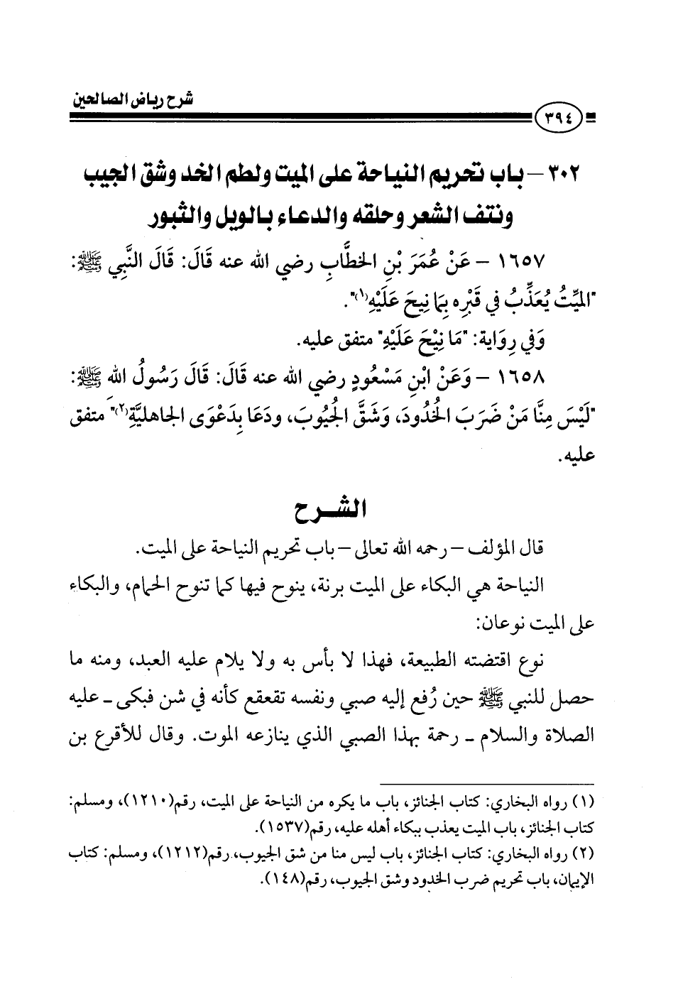 EXقال المؤلف رحمه الله تعالى في كتابه رياض الصالحين باب تحريم النياحة على الميت النياحة هي البكاء البكاء على الميت برنة ينوح فيها كما تنوح الحمام والبكاء على الميت نوعان نوع اقتضته الطبيعة فهذا لا بأس به ولا يلام عليه العبد ومنه ما حصل للنبي صلى الله عليه وسلم حين رفع إليه صبي ونفسه تقعقع كأنه في شن فبكى عليه الصلاة والسلام رحمة بهذا الصبي الذي ينازعه الموت فقال له الأقرع بن
