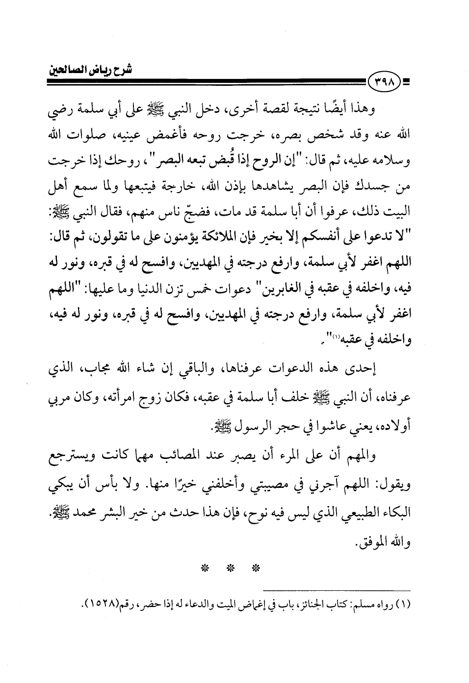 وهذا أيضا نتيجة لقصة أخرى دخل النبي صلى الله عليه وسلم على أبي سلمة رضي الله عنه وقد شخص بصره خرجت روحه فأغمض عينيه ثم قال إن الروح إذا قبضت تبعها البصر روحك إذا خرجت من جسدك البصر يشاهدها بإذن الله يشاهدها خارجة يتبعها فلما سمع أهل البيت ذلك عرفوا أن أبا سلمة قد مات فضجوا فقال النبي صلى الله عليه وسلم لا تدعوا على أنفسكم إلا بخير فإن الملائكة يؤمنون على ما تقولون ثم قال اللهم اغفر لأبي سلمة وارفع درجته في المهديين وأفسح له في قبره ونور له فيه واخلفه في عقبه في الغابرين دعوات خمس تزن الدنيا وما عليها اللهم اغفر لأبي سلمة وارفع درجته في المهديين وأفسح له في قبره ونور له فيه واخلفه في عقبه إحدى هذه الدعوات عرفناها والباقي إن شاء الله مجاب الذي عرفناه أن النبي صلى الله عليه وسلم خلف أبا سلمة في عقبه فكان زوج امرأته وكان مربي أولاده يعني عاشوا في حجر الرسول صلى الله عليه وسلم والمهم أن على المرء أن يصبر عند المصائب أين كانت ويسترجع ويقول اللهم آجرني في مصيبتي واخلفني خيرا منها ولا بأس أن يبكي البكاء الطبيعي الذي ليس فيه نوح فإن هذا حصل من خير البشر محمد صلى الله عليه وسلم والله الموفق