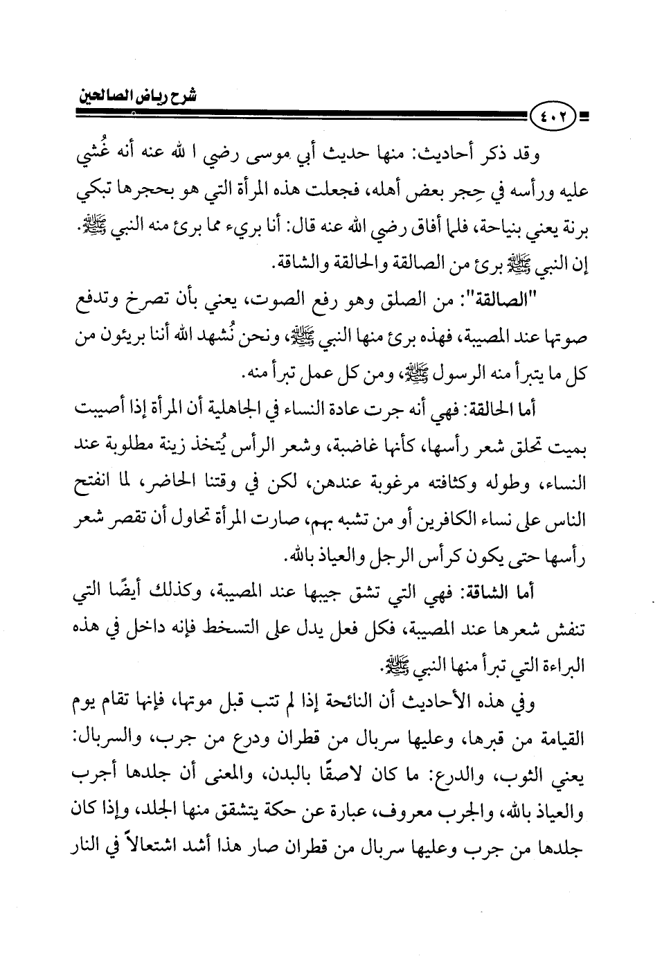 ذكر أحاديث منها حديث أبي موسى رضي الله عنه أنه غشي ورأسه في حجر بعض أهله فجعلت هذه المرأة التي هو بحجرها تبكي برنة يعني بنياحة فلما أفاق رضي الله عنه قال أنا بريء مما برئ منه النبي صلى الله عليه وسلم إن النبي صلى الله عليه وسلم بريء من الصالقة والحالقة والشاقة الصالقة من الصلق وهو رفع الصوت يعني بأن تصرخ وتعلي صوتها عند المصيبة فهذه برئ منها النبي صلى الله عليه وسلم ونحن نشهد الله أننا بريئون من كل ما يتبرأ منه الرسول صلى الله عليه وسلم ومن كل عمل تبرأ منه أما الحالقة فهي أنه جرت عادة النساء في الجاهلية أن المرأة إذا أصيبت بميت تحلق شعر رأسها كأنها غاضبة والرأس يتخذ زينة عند النساء وطوله وكثافته مرغوبة عند النساء لكن في وقتنا الحاضر لما انفتح الناس على نساء الكافرين أو من تشبه بهم صارت المرأة تحاول أن تقصر شعر رأسها حتى يكون كرأس الرجل والعياذ بالله أما الشاقة فهي التي تشق جيبها عند المصيبة وكذلك أيضا التي تنكش شعرها عند المصيبة كل فعل يدل على التضجر فإنه داخل في هذه البراءة التي تبرأ منها النبي صلى الله عليه وسلم وفي هذه الأحاديث أن النائحة إذا لم تتب قبل موتها فإنها تقام يوم القيامة من قبرها وعليها سربال من قطران ودرع من جرب السربال يعني الثوب والدرع ما كان لاصقا بالبدن والمعنى أن جلدها أجرب والعياذ بالله والجرب معروف هو عبارة عن حكة يتبرز منها الجلد وإذا كان جلدها من جرب وعليها سربال من قطران صار هذا أشد اشتعالا في النار