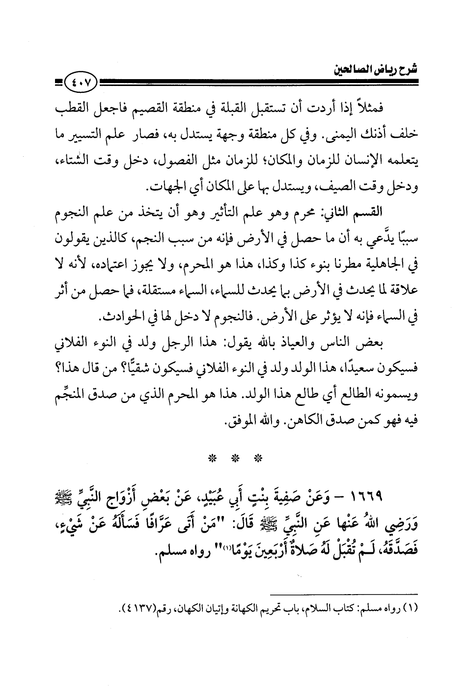 1669 - وعن صفية بنت أبي عبيد عن بعض أزواج النبي صلى الله عليه وسلم ورضي الله عنها عن النبي صلى الله عليه وسلم قال من أتى عرافا فسأله عن شيء فصدقه لم تقبل له صلاة أربعين يوما رواه مسلم