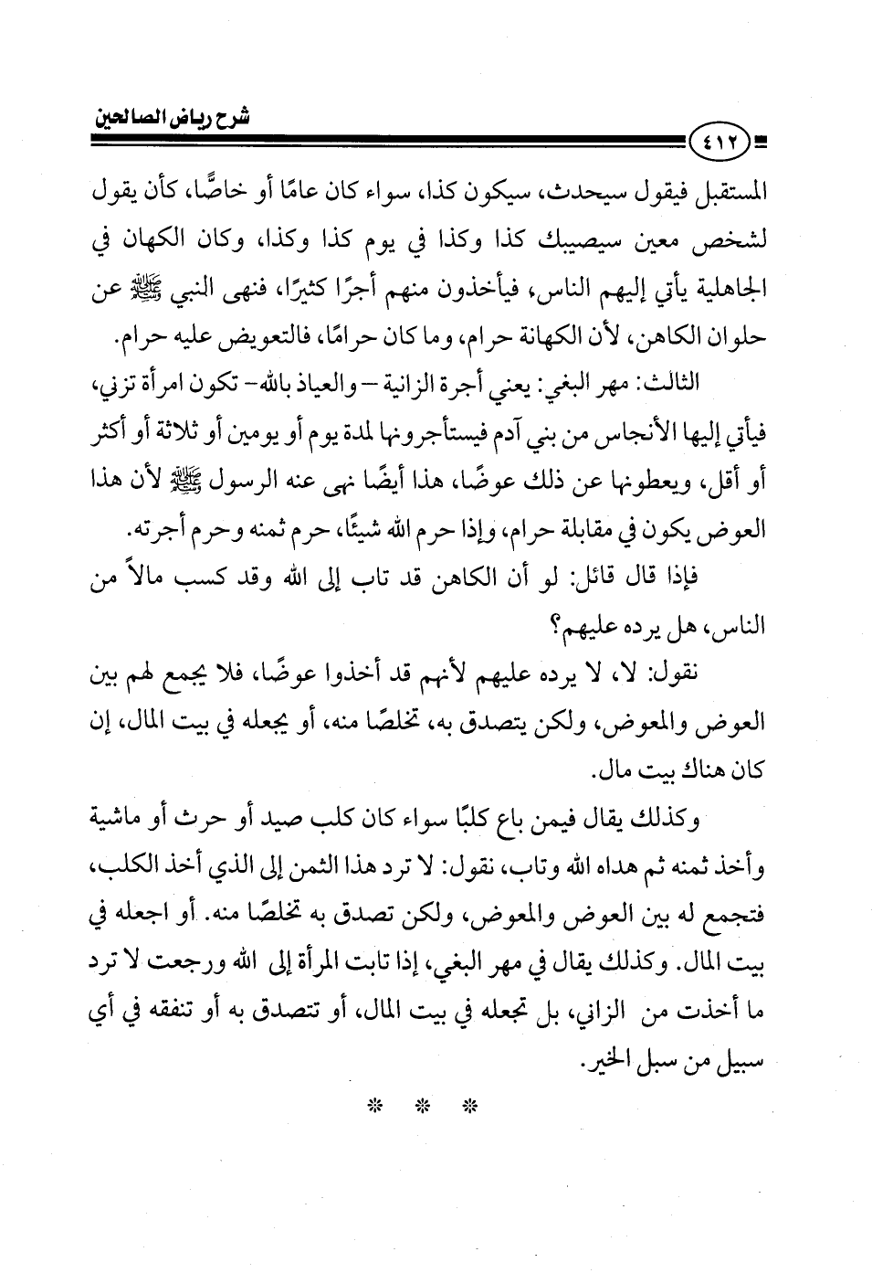 المستقبل فيقول سيحصل كذا سيكون كذا سواء كان عاما أو خاصا كأن يقول لشخص معين سيصيبك كذا وكذا في يوم كذا وكذا الكهان كانوا في الجاهلية يأتي إليهم الناس فيأخذون منهم أجرا كثيرا فنهى النبي صلى الله عليه وسلم عن حلوان الكاهن لأن الكهانة حرام وما كان حراما فالتعويض عليه حرام الثالث مهر البغي يعني أجرة الزانية والعياذ بالله تكون امرأة تزني فيأتي إليها الأنجاس من بني آدم فيستأجرونها لمدة يوم أو يومين أو ثلاثة أو أكثر أو أقل ويعطونها عن ذلك عوضا هذا أيضا نهى عنه الرسول صلى الله عليه وسلم لأن هذا العوض يكون في مقابلة حرام وإذا حرم الله شيئا حرم ثمنه وحرم أجرته فإذا قال قائل لو أن الكاهن قد تاب إلى الله وقد كسب مالا من الناس هل يرده عليهم نقول لا لا يرده عليهم لأن قد أخذوا عوضا فلا يجمع لهم بين العوض والمعوض ولكن يتصدق به تخلصا منه أو يجعله في بيت المال إن كان هناك بيت مال وكذلك يقال فيمن باع كلبا سواء كان كلب صيد أو حرث أو ماشية وأخذ ثمنه ثم هداه الله وتاب نقول لا ترد هذا الثمن إلى الذي أخذ الكلب فتجمع له بين العوض والمعوض ولكن تصدق به تخلصا منه أو اجعله في بيت المال وكذلك يقال في مهر البغي إذا تابت إلى الله ورجعت هل ترد ما أخذت من الزاني عليه أو لا لا ترده عليه بل تجعله في بيت المال أو تصدق به أو تنفقه في أي سبيل من سبل الخير