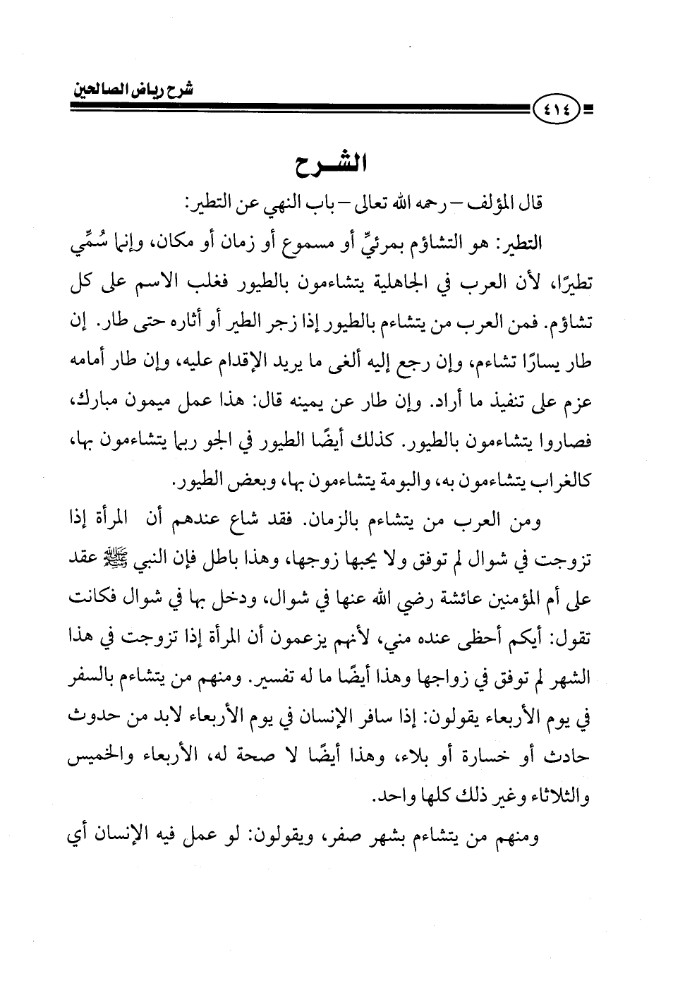 EXقال المؤلف رحمه الله تعالى في كتابه رياض الصالحين باب التطير التطير هو التشاؤم بمرئي أو مسموع أو زمان أو مكان هذا هو التطير أن يتشاءم الإنسان في الشيء وإنما سمي تطيرا لأن العرب في الجاهلية يتشاءمون بالطيور فغلب الاسم على كل التشاؤم فمن العرب من يتشاءم بالطيور إذا زجر الطير أو أثاره حتى طار إن طار يسارا تشاءم وإن رجع إليه ألغى ما يريد الإقدام عليه وإن طار أمامه عزم على تنفيذ ما أراد وإن طار على يمينه قال هذا عمل ميمون مبارك فصاروا يتشاءمون بالطيور كذلك أيضا الطيور في الجو ربما يتشاءمون بها الغراب يتشاءم به والبومة يتشاءمون بها وبعض الطيور ومن العرب من يتشاءم بالزمان لقد شاع عندهم أن المرأة إذا تزوجت في شوال لم توفق ولا يحبها زوجها وهذا باطل فإن النبي صلى الله عليه وسلم عقد على أم المؤمنين عائشة رضي الله عنها في شوال ودخل بها في شوال فكانت تقول أيكم أحظى عنده مني لأنهم يزعمون أن المرأة إذا تزوجت في هذا الشهر لم توفق في زواجها وهذا أيضا ما له تفسير ومنهم من يتشاءم بالسفر في يوم الأربعاء يقولون إذا سافر الإنسان في يوم الأربعاء لابد من حدوث حادث أو خسارة أو بلاء وهذا أيضا لا صحة له الأربعاء والخميس والثلاثاء وغير ذلك كلها واحد ومنهم من يتشاءم بشهر صفر صفر الذي بعد محرم ويقولون لو عمل فيه الإنسان أي
