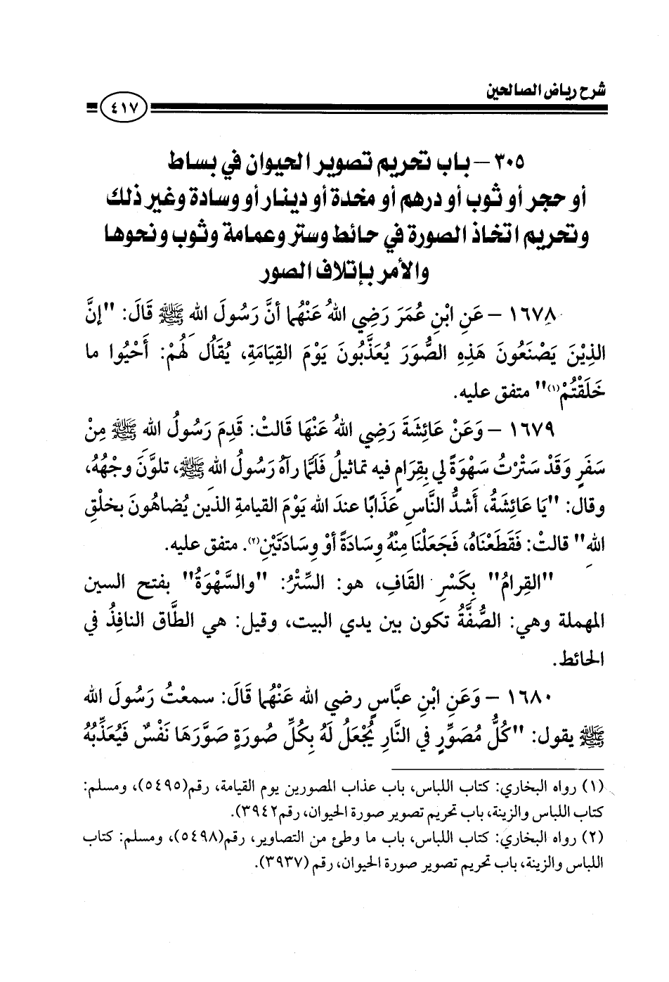 1679 - وعن عائشة رضي الله عنها قالت: قدم رسول الله صلى الله عليه وسلم من سفر وقد سترت سهوة لي بقرام فيه تماثيل فلما رآه رسول الله صلى الله عليه وسلم تلون وجهه وقال يا عائشة أشد الناس عذابا عند الله يوم القيامة الذين يضاهون بخلق الله قالت فقطعناه فجعلنا منه وسادة أو وسادتين متفق عليه القرام بكسر القاف هو الستر والسهوة بفتح السين المهملة وهي الصفة تكون بين يدي البيت وقيل هي الطاق النافذ في الحائط