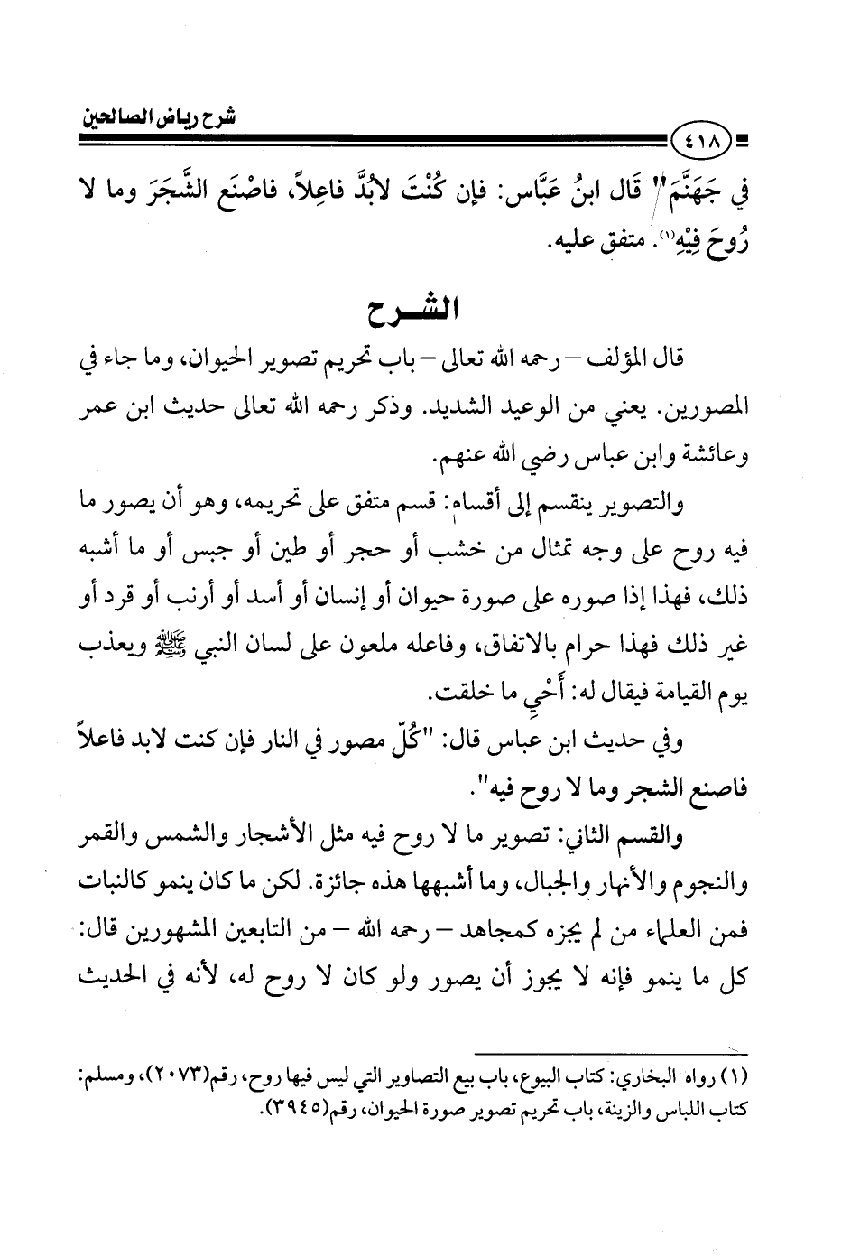 EXقال المؤلف رحمه الله تعالى في كتاب رياض الصالحين باب ما جاء في المصورين يعني من الوعيد الشديد وذكر رحمه الله تعالى حديث ابن عمر وعائشة وابن عباس رضي الله عنهم والتصوير ينقسم إلى قسمين قسم متفق على تحريمه وهو أن يصور ما فيه روح على وجه تمثال من خشب أو حجر أو طين أو جبس أو ما أشبه ذلك فهذا إذا صوره على صورة حيوان أو إنسان أو أسد أو أرنب أو قرد أو غير ذلك فهذا حرام بالاتفاق وفاعله ملعون على لسان النبي صلى الله عليه وسلم ويعذب يوم القيامة فيقال له أحيي ما خلقت وفي حديث ابن عباس قال كل مصور في النار..