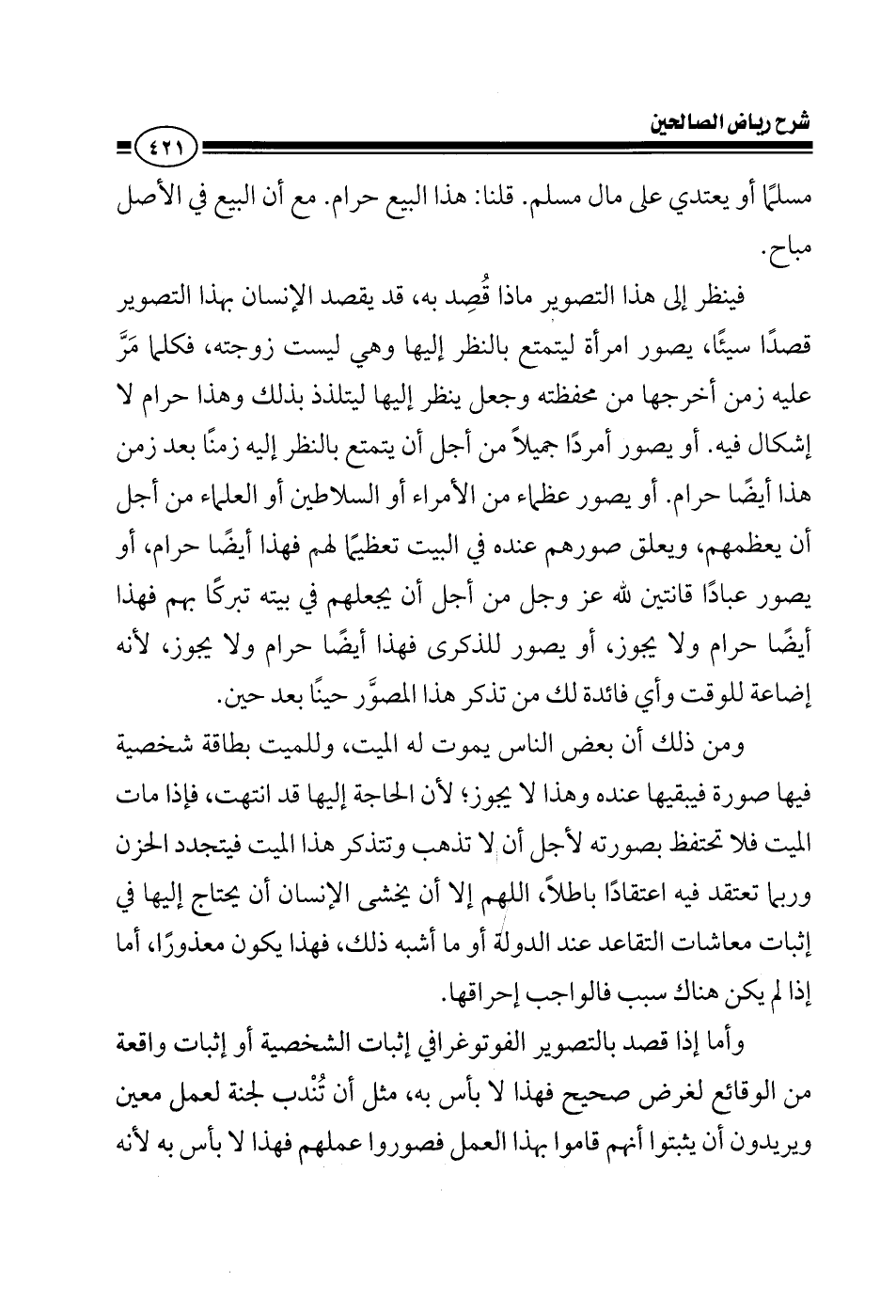 مسلما أو يعتدي على مال مسلم قلنا هذا البيع حرام مع أن البيع في الأصل مباح فينظر إلى هذا التصوير ماذا قصد به قد يقصد الإنسان بهذا التصوير قصدا سيئا يصور امرأة ليتمتع بالنظر إليها وهي ليست زوجته كل ما مضى زمن أخرجها من محفظته أو ممن يسمونه الألبوم وجعل ينظر إليها ليتلذذ بذلك وهو حرام لا إشكال فيه يصور أمردا جميلا من أجل أن يتمتع بالرؤية إليه زمنا بعد زمن هذا أيضا حرام يصور عظماء من الأمراء أو السلاطين أو العلماء من أجل أن يعظمهم ويعلقهم عنده في البيت تعظما لهم في البيت هذا أيضا حرام يصور عبادا قانتين لله من أجل أن يجعلهم في بيته تبركا بهم هذا أيضا حرام ولا يجوز يصور للذكرى هذا أيضا حرام ولا يجوز لأنه إضاعة للوقت وأي فائدة لك أن تذكر هذا المصور حينا بعد حين وأشد من ذلك أن بعض الناس يموت له الميت وللميت صورة فيبقيها عنده وهذا لا يجوز إذا مات الميت فأحرق صورته لأجل أن لا تذهب تتذكر هذا الميت كل ما أردت أن تتذكره فيتجدد الحزن وربما تعتقد فيه اعتقادا باطلا فبمجرد أن يموت تحرق لا فائدة منها اللهم إلا أن يكون الإنسان يخشى أن يحتاج إليها في إثبات معاشات تقاعد عند الدولة أو ما أشبه ذلك فهذا يكون معذورا أما إذا لم يكن هناك سبب فواجب إحراقها وأما إذا قصد في التصوير الفوتوغرافي إذا قصد به إثبات الشخصية أو إثبات وقائع من الواقع لغرض صحيح فهذا لا بأس به مثل أن تندب لجنة لعمل ما ندبتها الحكومة وأرادوا أن يثبتوا أنهم قاموا بهذا العمل فصوروا عملهم فلا بأس به لأنه