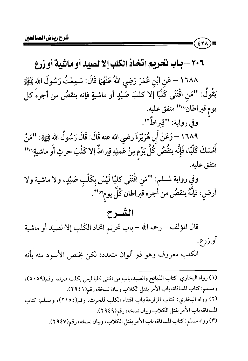 EXقال المؤلف رحمه الله في كتابه رياض الصالحين باب تحريم اتخاذ الكلب إلا لحرث أو صيد أو ماشية الكلب معلوم وهو ذو ألوان متعددة لكن يختص الأسود منه بأنه