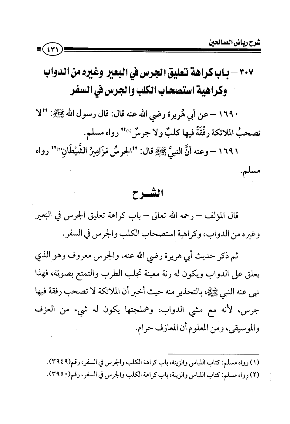 EXقال المؤلف رحمه الله تعالى في كتابه رياض الصالحين باب كراهية تعليق الجرس على الدواب وشبهها وكراهة استصحاب الكلب والجرس في السفر ثم ذكر حديث أبي هريرة رضي الله عنه والجرس معلوم وهو هذا الذي يعلق على الدواب ويكون له رنة معينة تجلب النشوى والطرب والتمتع بصوته فهذا نهى عنه النبي صلى الله عليه وسلم نهى عنه بالتحذير منه حيث أخبر أن الملائكة لا تصحب رفقة فيها جرس لأنه مع مشي الدواب وهملجتها يكون له شيء من العزف والموسيقى ومن المعلوم أن المعازف حرام