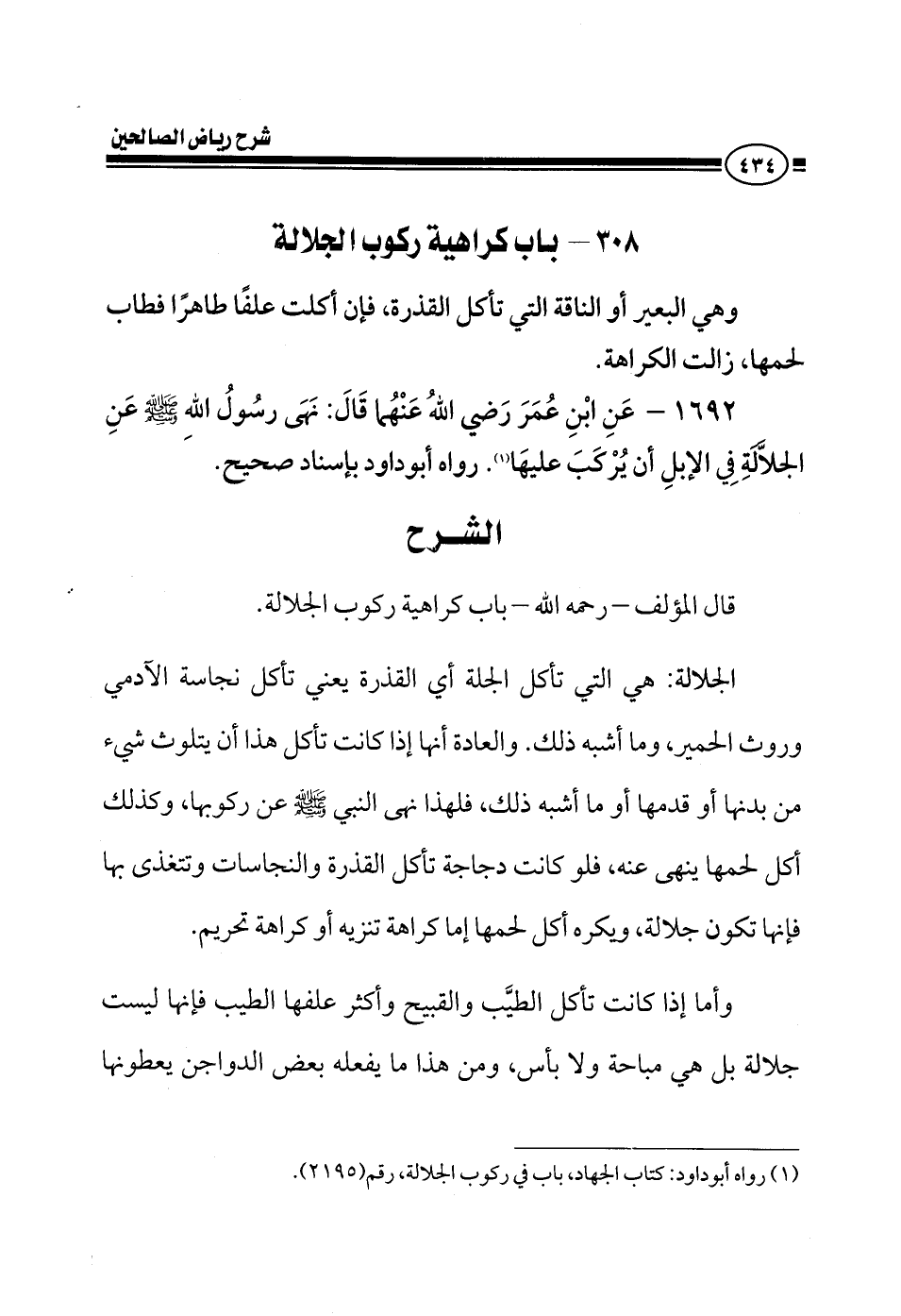 EXقال المؤلف رحمه الله في كتابه رياض الصالحين باب النهي عن ركوب الجلالة الجلالة هي التي تأكل الجلة أي العذرة يعني تأكل نجاسة الآدمي وروث الحمير وما أشبه ذلك والعادة أنها إذا كانت تأكل هذا أن يتلوث شيء من بدنها أو قدمها أو ما أشبه ذلك فلهذا نهى النبي صلى الله عليه وسلم عن ركوبها وكذلك أكل لحمها ينهي عنه لو كانت دجاجة مخلاة تأكل العذرة والنجاسات وتتغذى بها فإنها تكون جلالة ويكره أكل لحمها إما كراهة تنزيه أو كراهة تحريم وأما إذا كانت تأكل الطيب والقبيح وأكثر علفها الطيب فإنها ليست جلالة بل هي مباحة ولا بأس ومن هذا ما يفعله بعض أرباب الدواجن يعطونها