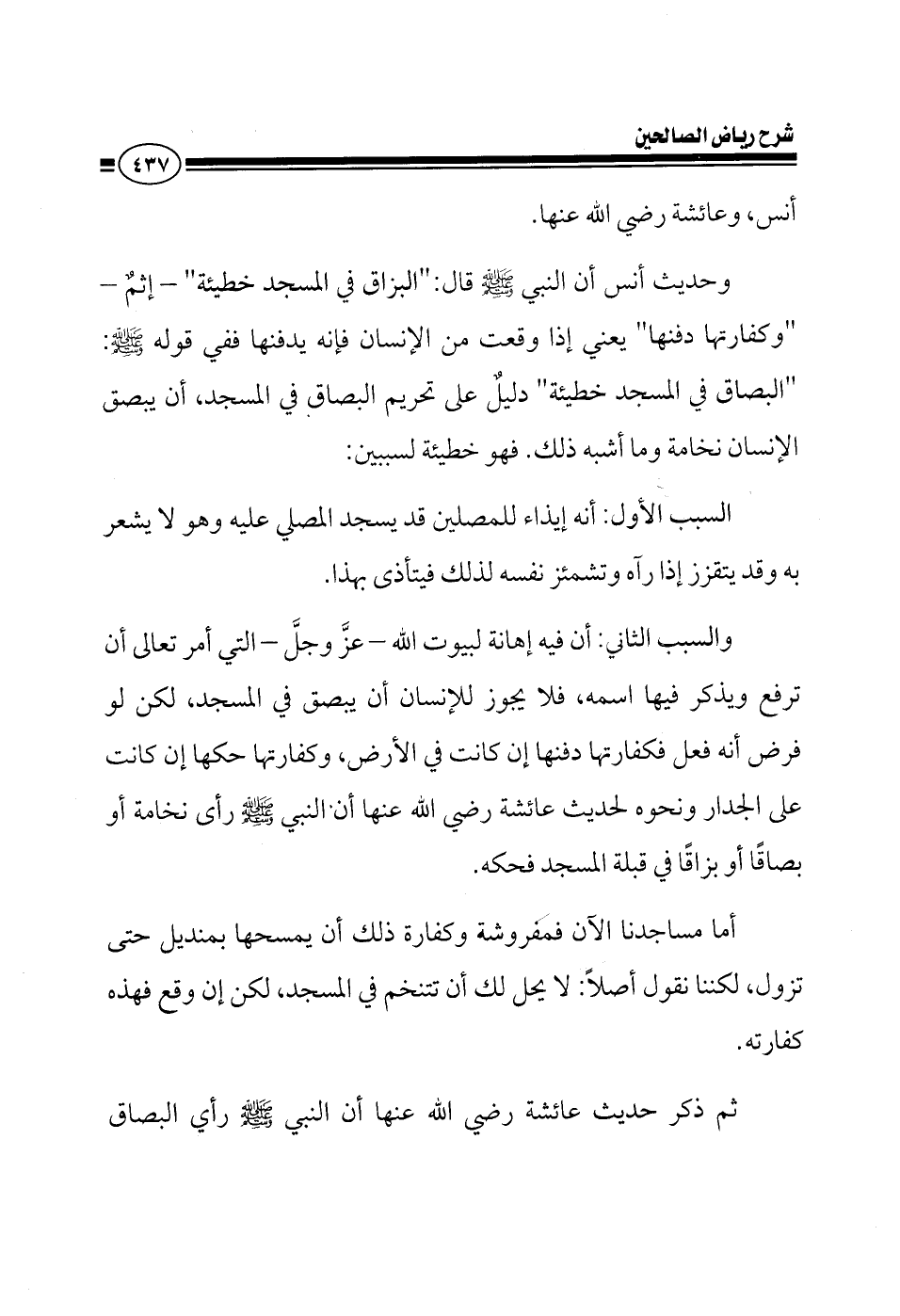 أنس وعائشة رضي الله عنهما حديث أنس أن النبي صلى الله عليه وسلم قال البصاق في المسجد خطيئة يعني إثما وكفارتها دفنها يعني إذا وقعت من الإنسان فإنه يدفنها ففي قوله صلى الله عليه وسلم البصاق في المسجد خطيئة دليل على تحريم البصاق في المسجد أن يبصق الإنسان نخامة أو أن يتنخع في المسجد وما أشبه ذلك فهو خطيئة بسببين السبب الثاني أنه إيذاء للمصلين قد يسجد المصلي عليه وهو لا يشعر به وقد يتقزز إذا رآه وتتكره نفسه لذلك فيتأذى بهذا والسبب الأول أن فيه إهانة لبيوت الله عز وجل الذي أمر تعالى أن ترفع ويذكر فيها اسمه فلا يجوز للإنسان أن يبصق في المسجد لكن لو فرض أنه فعل فكفارتها دفنها إن كانت في الأرض وكفارتها حكها إن كانت على الجدار ونحوه لحديث عائشة رضي الله عنها أن النبي صلى الله عليه وسلم رأى نخامة أو بصاقا أو بزاقا في قبة المسجد فحكه فصارت كفارة ذلك إن كانت على الأرض ففي دفنه إن كانت على الجدار فحكها حتى تزول أما مساجدنا الآن فكما ترون مفروشة كفارة ذلك أن يمسحها بمنديل حتى تزول لكننا نقول أصلا لا يحل لك أن تتنخم في المسجد لكن إن وقع فهذه كفارته ثم ذكر حديث عائشة رضي الله عنها أن النبي صلى الله عليه وسلم رأى البصاق