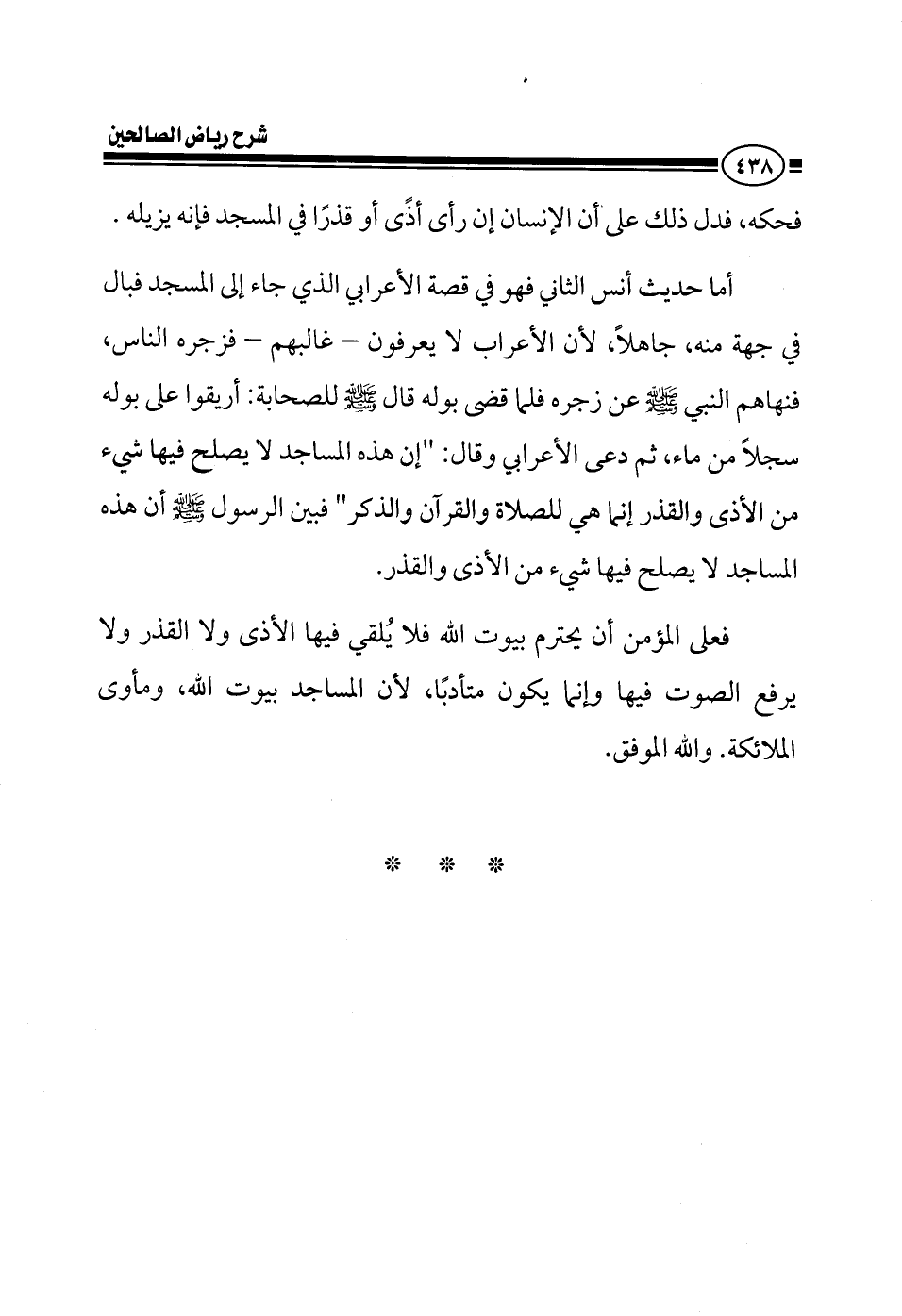 فحكه فدل ذلك على أن الإنسان إن رأى أذى أو قذرا في المسجد فإنه يزيله أما حديث أنس الثاني فهو في قصة الأعرابي الذي جاء إلى المسجد فبال في جهة منه جاهلا لأن الأعراب لا يعرفون غالبهم فزجره الناس فنهاهم النبي صلى الله عليه وسلم عن زجره فلما قضى بوله قال صلى الله عليه وسلم للصحابة أريقوا على بوله سجلا من ماء ثم دعى الأعرابي وقال إن هذه المساجد لا يصلح فيها شيء من الأذى والقذر إنما هي للصلاة والقرآن والذكر فبين الرسول صلى الله عليه وسلم أن هذه المساجد لا يصلح فيها شيء من الأذى والقذر فعلى المؤمن أن يحترم بيوت الله فلا يلق فيها الأذى ولا القذر ولا يرفع الصوت فيها وإنما يكون متأدبا لأن المساجد بيوت الله ومأوى الملائكة والله الموفق